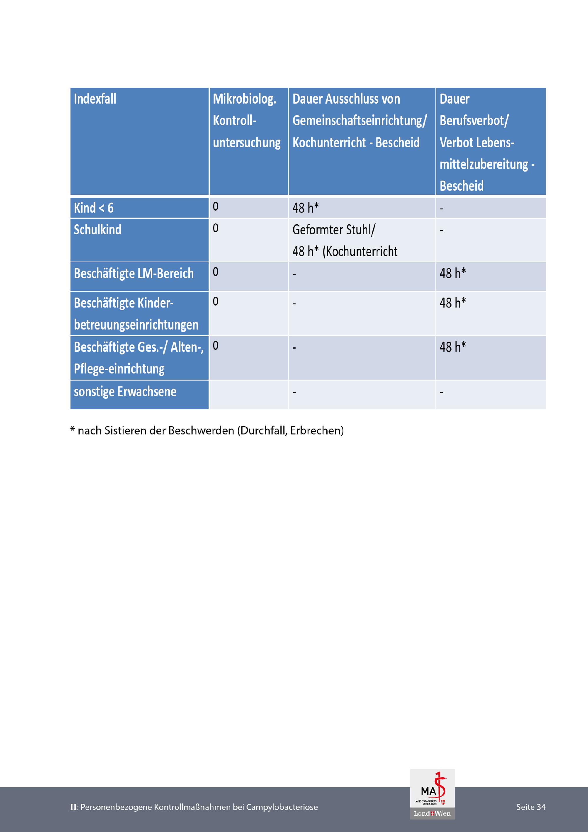 Leitlinie personenbezogene Kontrollmaßnahmen bei lebensmittelbedingten Krankheiten / Herausgeberin Landessanitätsdirektion Wien - Magistratsabteilung 15. Teil 1 / Salmonellose (Salmonella non-typhi), Campylobacteriose