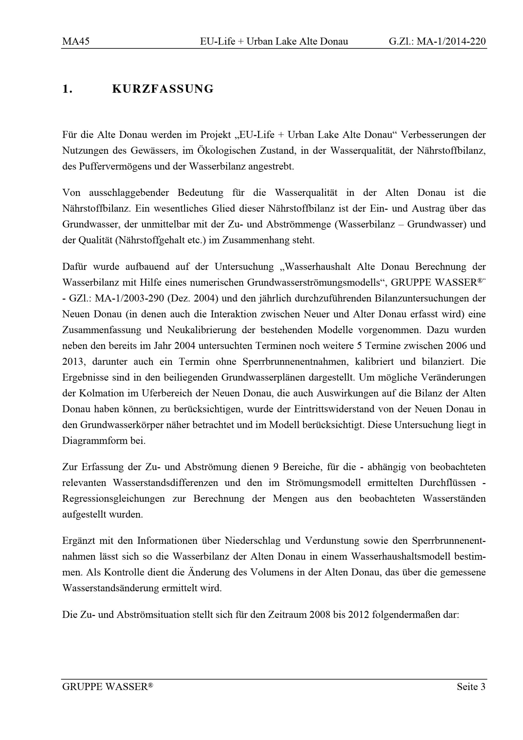 EU-Life + Urban lake : Alte Donau : Aktualisierung der hydrologischen Bilanz : Bericht / betreuender Zivilingenieur: Dipl.-Ing. Raimund Taschke ; Projektleiterin: Dipl.-Ing. Christine Voggenberger ; Auftraggeber: Magistrat der Stadt Wien, Magistratsabteilung 45 - Wiener Gewässer