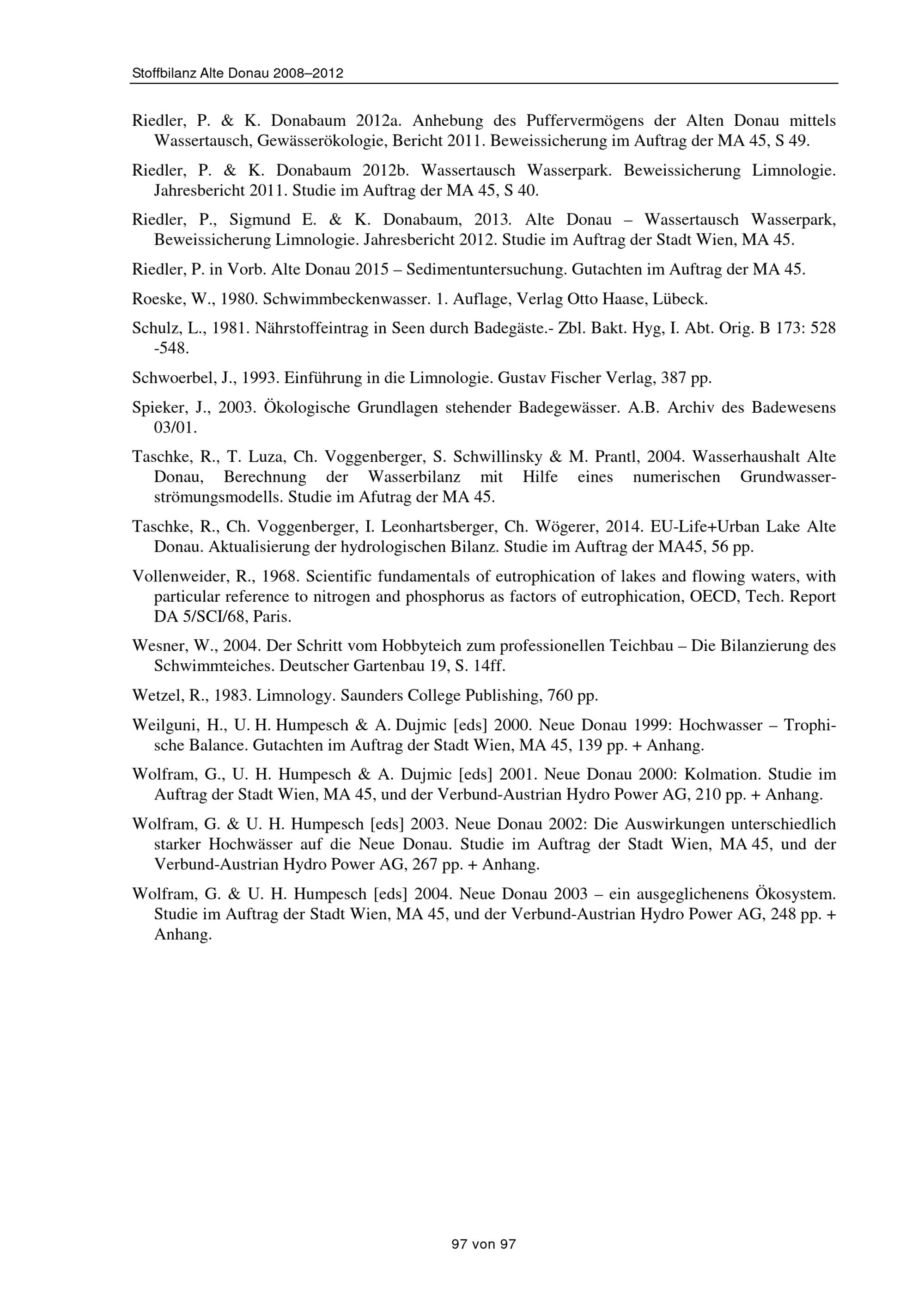 Stoffbilanz Alte Donau 2008-2012 : EU-Life+ Urban Lake Alte Donau / Auftraggeber: Magistratsabteilung 45 - Wiener Gewässer ; Projektleitung: Dr. Karl Donabaum ; Autoren: Mag. Patricia Riedler, Mag. Dr. Georg Wolfram