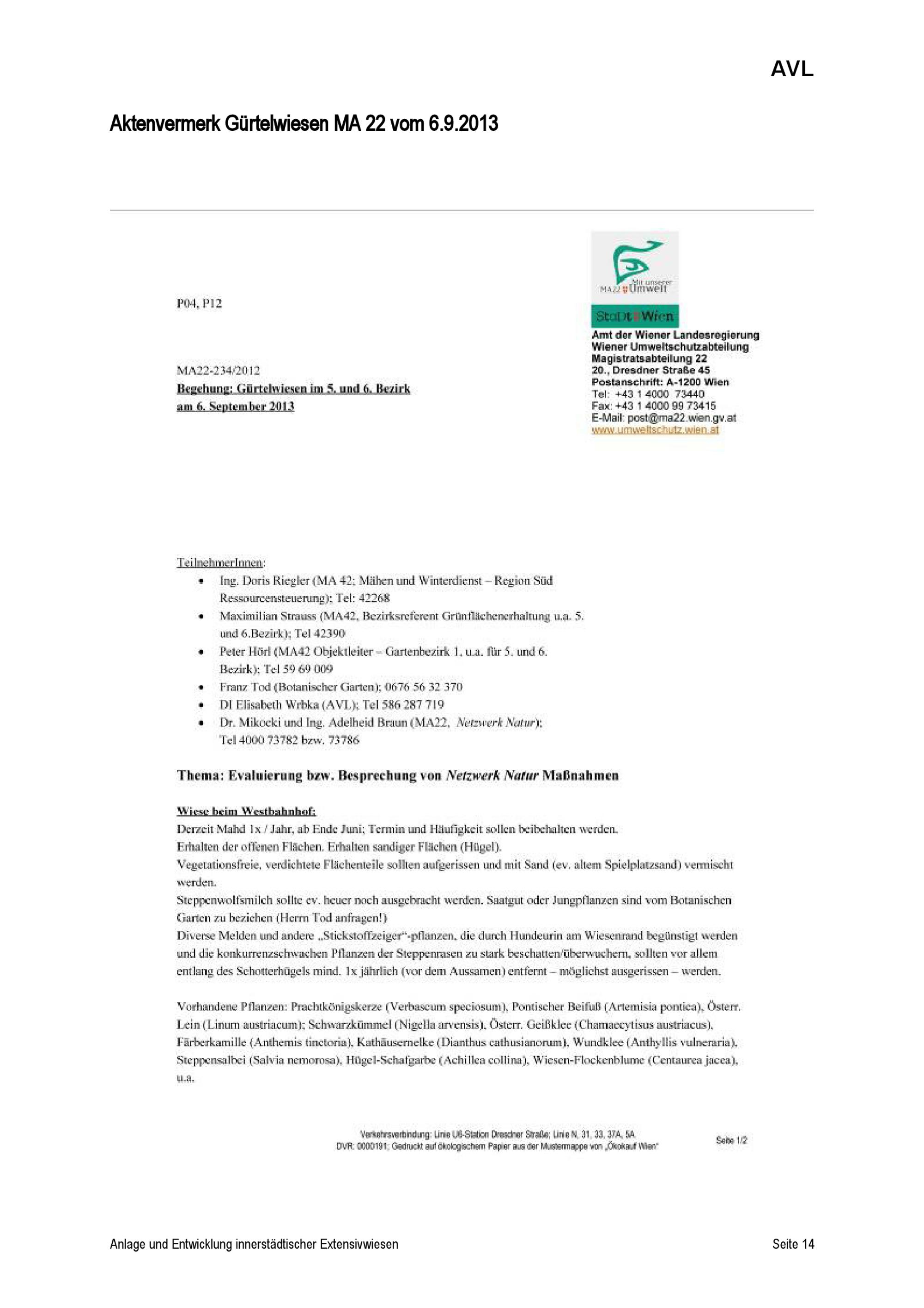 Anlage und Entwicklung von Extensivwiesenauf innerstädtischen Grünflächenam Beispiel Mariahilfer Gürtel / DI Elisabeth Wrbka ; im Auftrag der Wiener Umweltschutzabteilung - MA 22