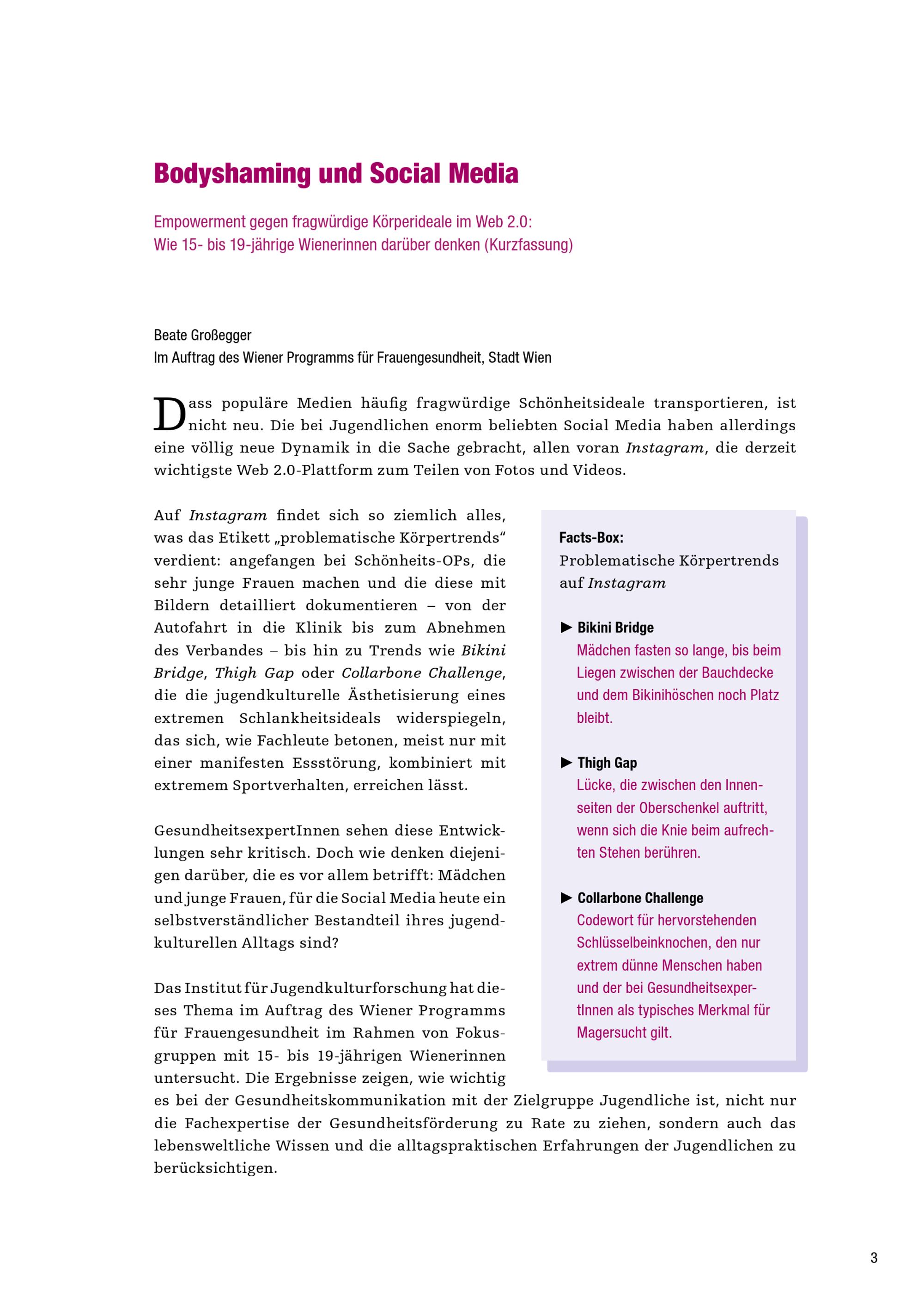 Bodyshaming und Social Media : Empowerment gegen fragwürdige Körperideale im Web 2.0: Wie 15- bis 19-jährige Wienerinnen darüber denken (Kurzfassung) / Beate Großegger ; im Auftrag des Wiener Programms für Frauengesundheit, Stadt Wien