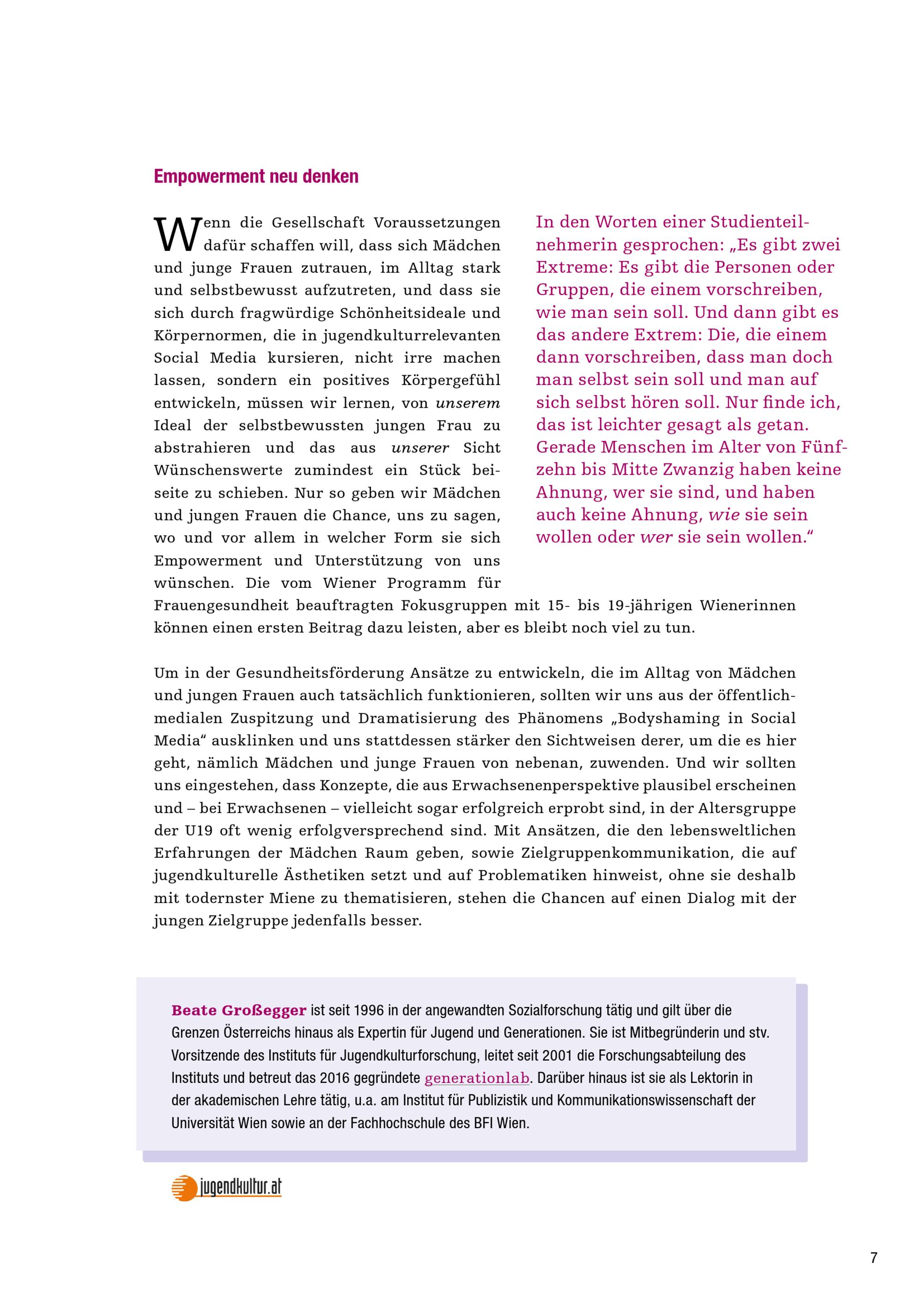 Bodyshaming und Social Media : Empowerment gegen fragwürdige Körperideale im Web 2.0: Wie 15- bis 19-jährige Wienerinnen darüber denken (Kurzfassung) / Beate Großegger ; im Auftrag des Wiener Programms für Frauengesundheit, Stadt Wien