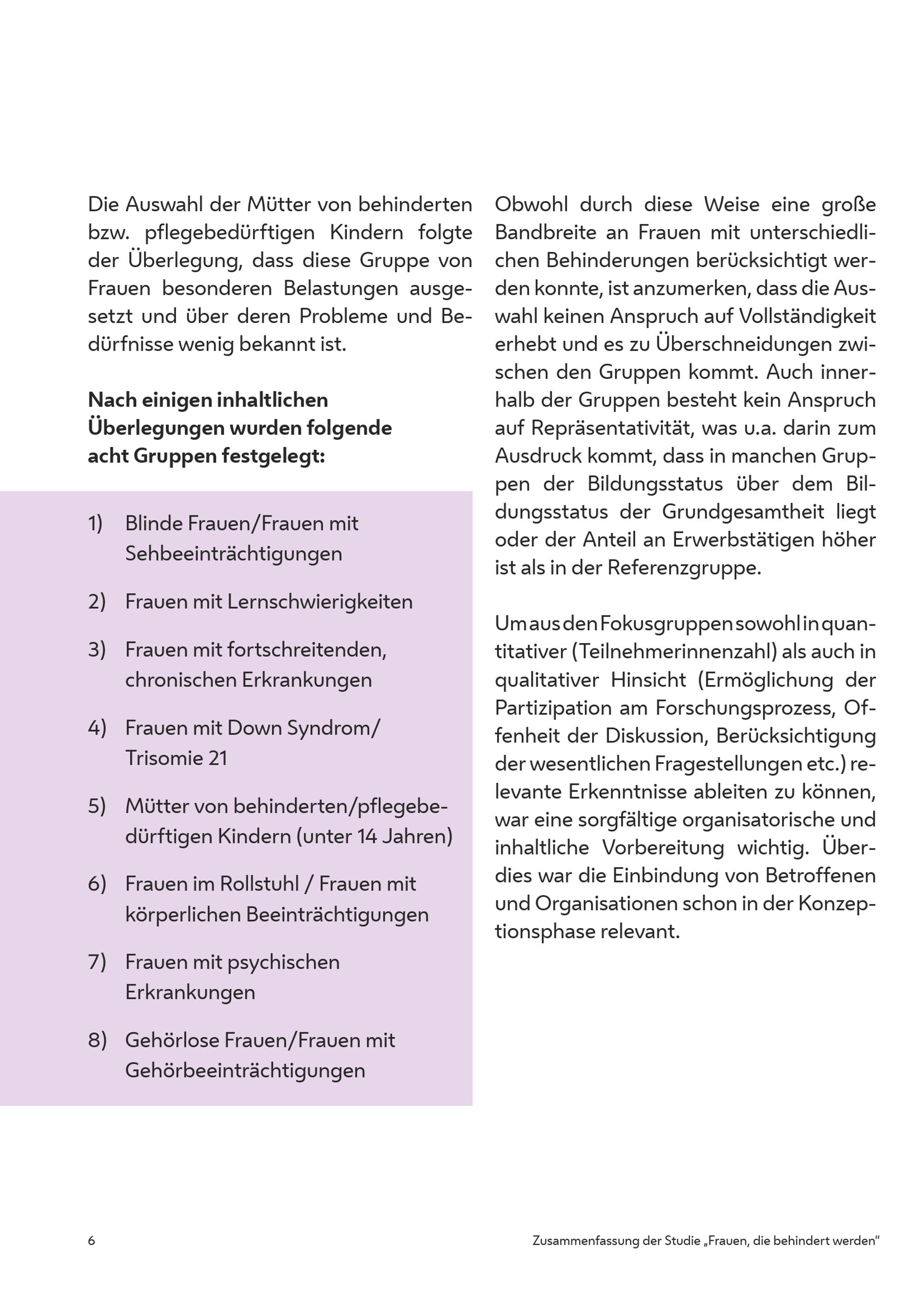 Frauen, die behindert werden ... : ... auf ihrem Weg zur Gleichstellung in Wien : Zusammenfassung der qualitativen Studie mit und über Frauen mit Behinderung in Wien (2019) / im Auftrag des Frauenservice Wien (MA 57) : Autorinnen: Claudia Sorger und Nadja Bergmann (L&R Sozialforschung)
