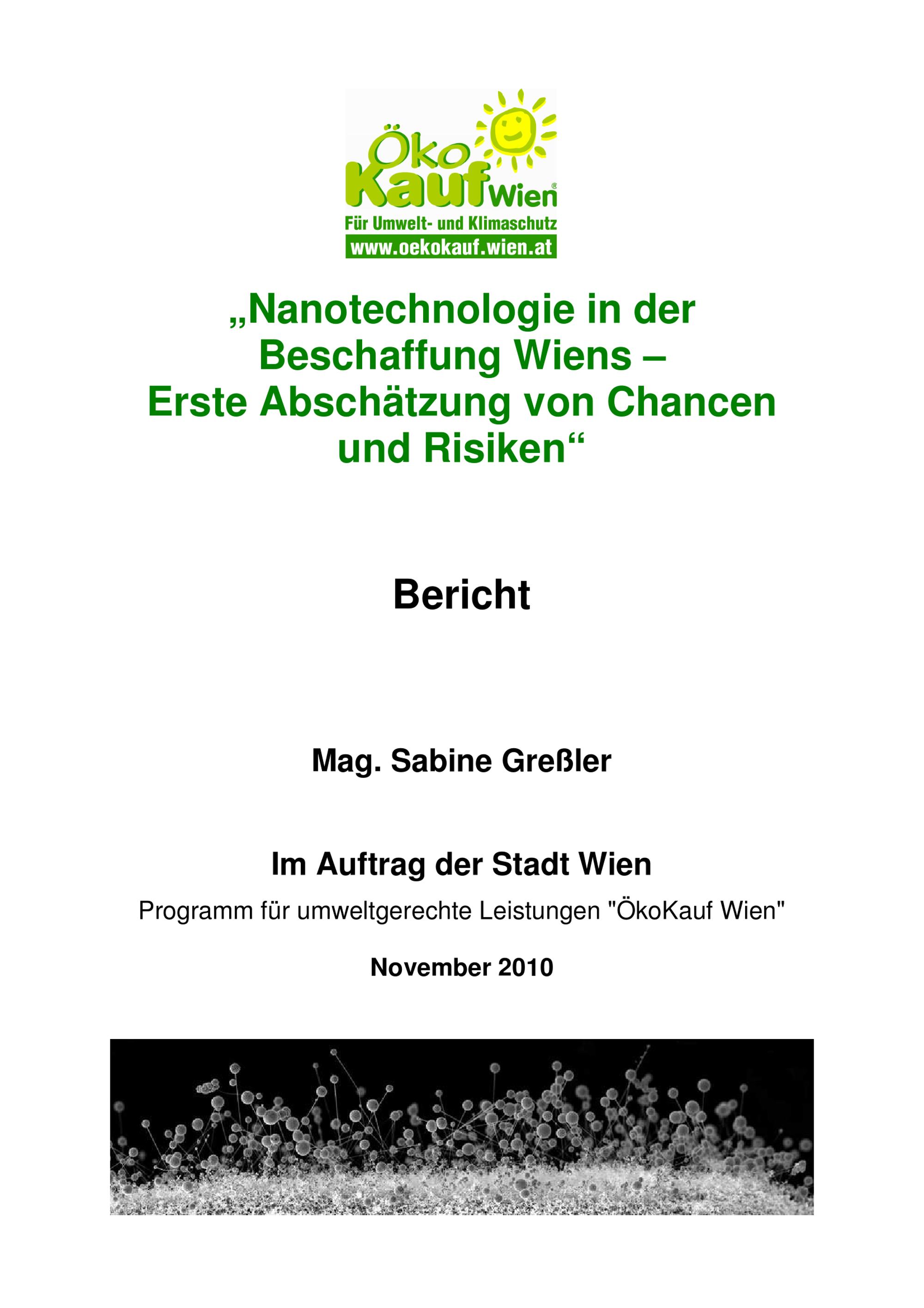 „Nanotechnologie in der Beschaffung Wiens - Erste Abschätzung von Chancen und Risiken“ : Bericht / Mag. Sabine Greßler ; im Auftrag der Stadt Wien Programm für umweltgerechte Leistungen "ÖkoKauf Wien"