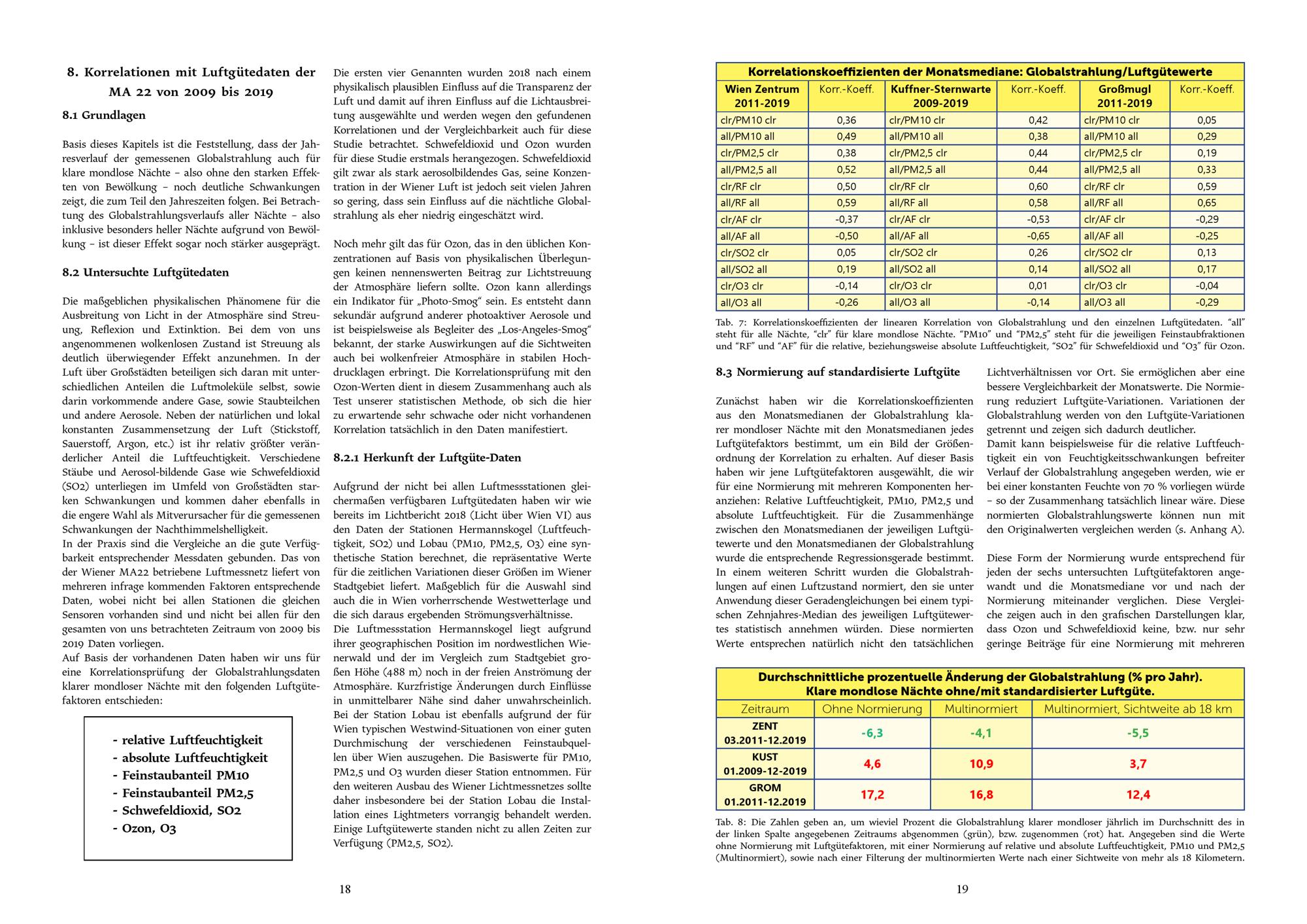 Licht über Wien VII : Lichtgehalt der Nacht über Wien von 2009 bis 2019 : Energiegehalt des Kunstlichthalos über Wien : Relationen von nächtlichem Lichtgehalt und Luftgütedaten : Normierung von Lichtmessungen mit Luftgütedaten / Dr. Günther Wuchterl, Markus Reithofer ; Studie im Auftrag der Wiener Umweltschutzabteilung – MA 22