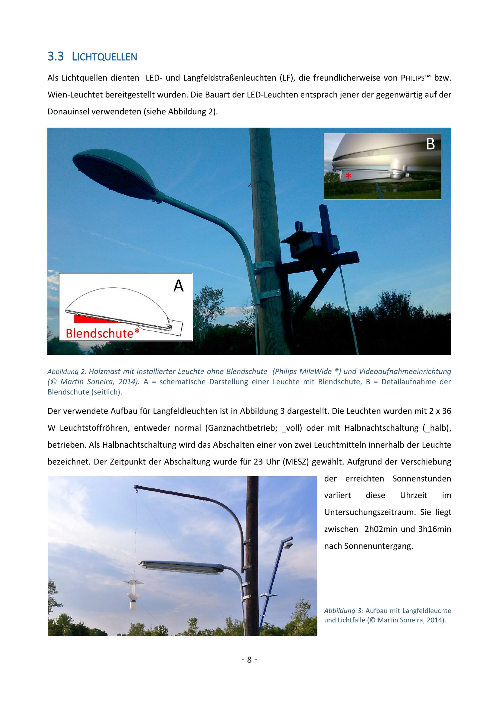 Bericht zu den Auswirkungen von Blendschute und Halbnachtschaltung auf nachtaktive Insekten, sowie deren Flugzeitrhythmen und Aufenthaltszeiten an LED- und Langfeldleuchten : eine Auftragsstudie von Wien Leuchtet (MA 33 der Stadt Wien) / Verfasser Martin Soneira