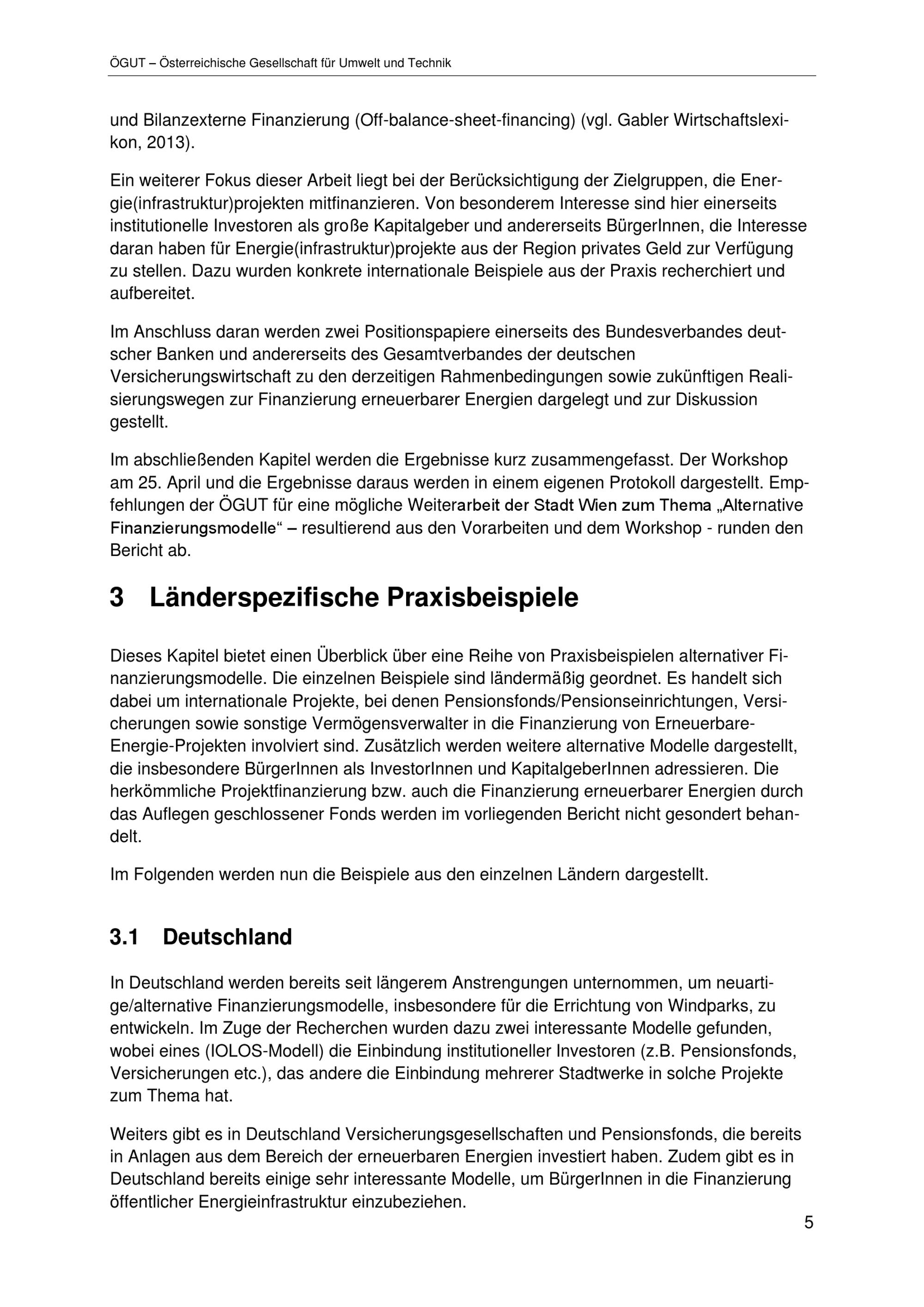 Alternative Finanzierungsmodelle mit besonderem Fokus auf (Energie-) Infrastrukturprojekte der Stadt Wien : Bericht / Medieninhaber und Herausgeber: Magistrat der Stadt Wien Magistratsabteilung 20 - Energieplanung ; Autorinnen: Maga. Susanne Hasenhüttl, Drin. Katharina Sammer, DI Thomas Sturm