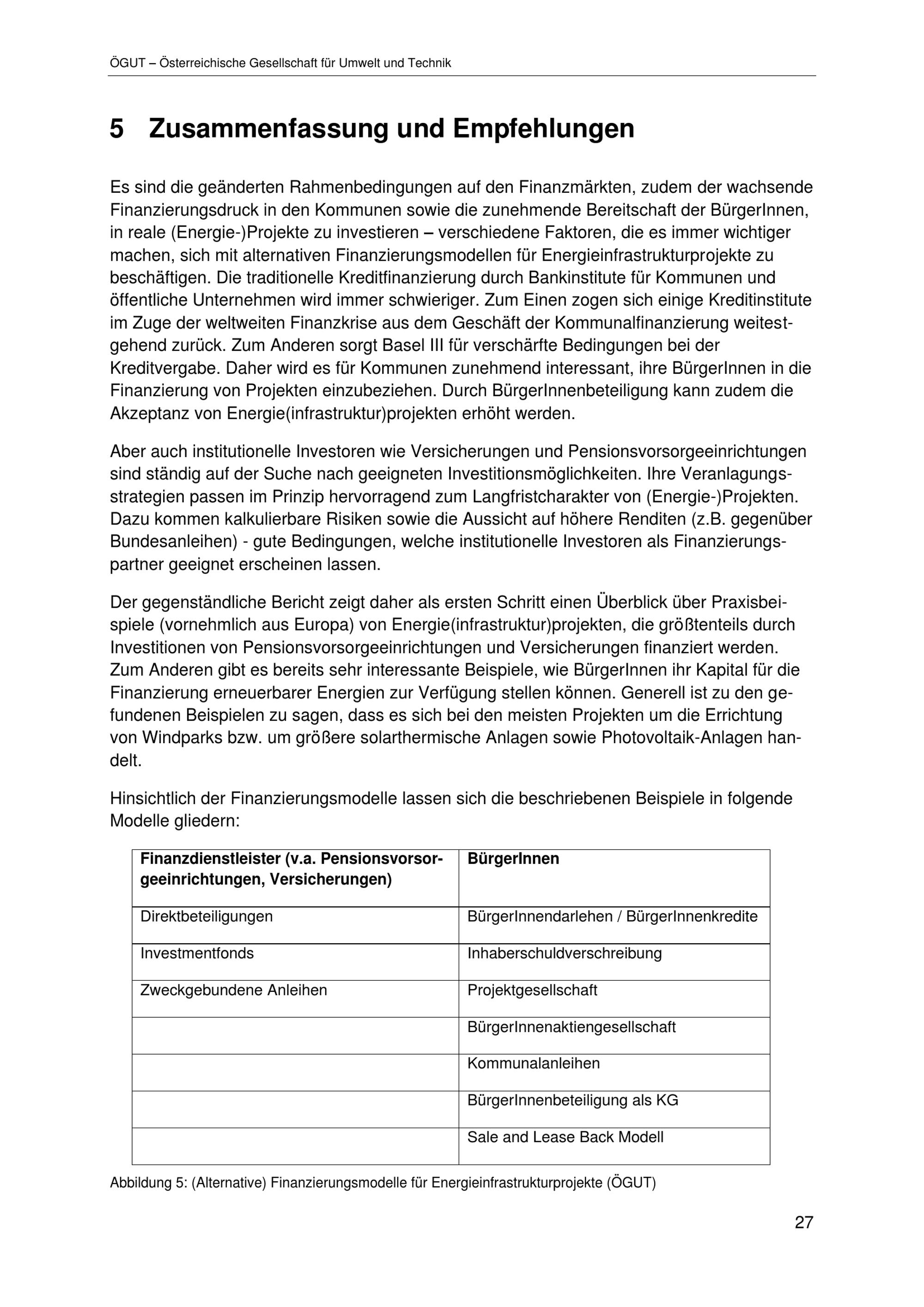 Alternative Finanzierungsmodelle mit besonderem Fokus auf (Energie-) Infrastrukturprojekte der Stadt Wien : Bericht / Medieninhaber und Herausgeber: Magistrat der Stadt Wien Magistratsabteilung 20 - Energieplanung ; Autorinnen: Maga. Susanne Hasenhüttl, Drin. Katharina Sammer, DI Thomas Sturm