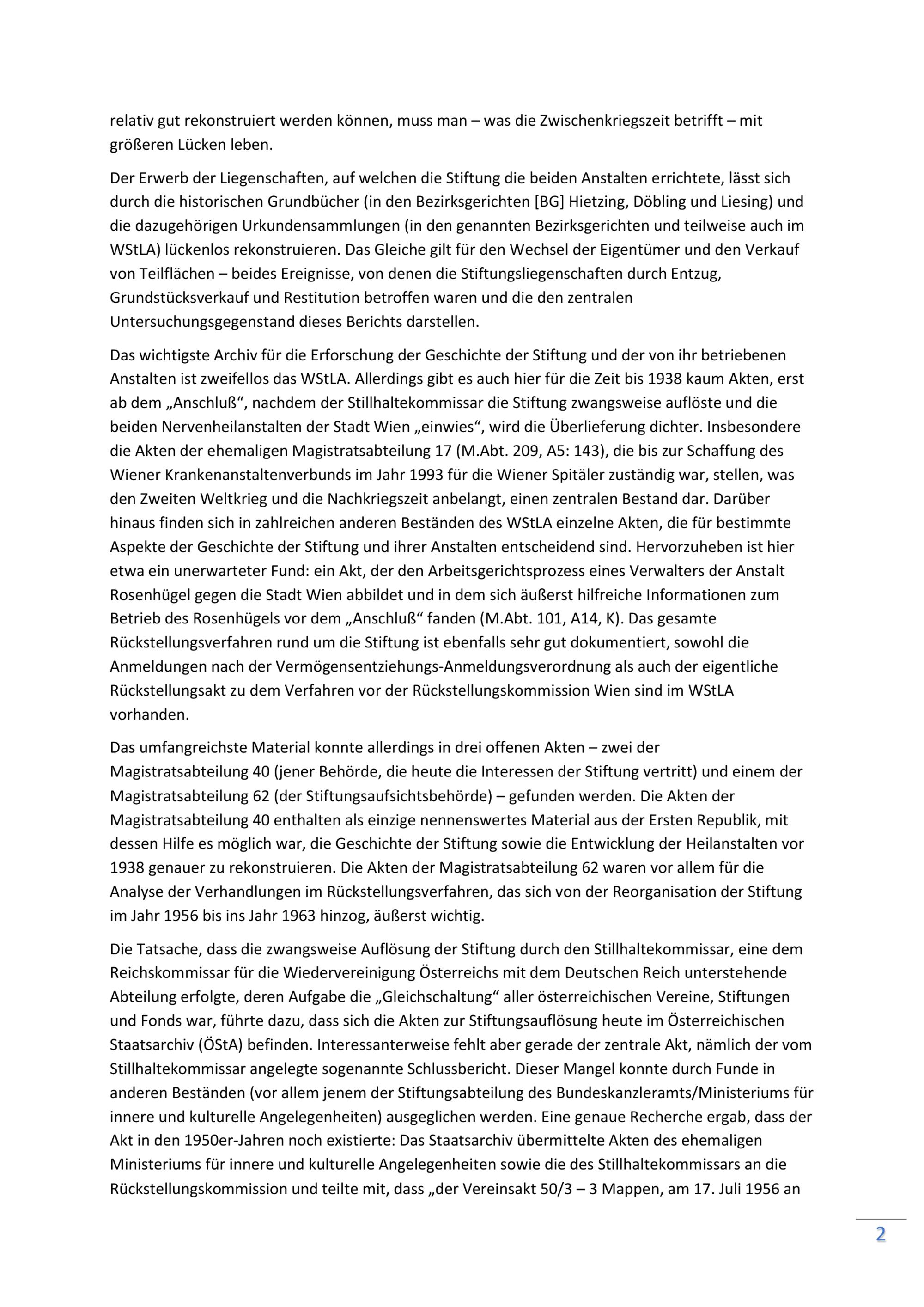Geschichte der Nathaniel Freiherr von Rothschild’schen Stiftung für Nervenkranke von ihrer Errichtung bis zu ihrer Reorganisation in der Nachkriegszeit / erstellt im Auftrag der Geschäftsgruppen Soziales, Gesundheit und Sport (Stadtrat Peter Hacker) sowie Kultur und Wissenschaft (Stadträtin Veronica Kaup-Hasler) ; Univ. Prof.in Dr.in Ilse Reiter-Zatloukal (Leitung), Mag. Dr. Gerhard Baumgartner, Univ. Prof. DDr. Oliver Rathkolb, Univ. Prof. Dr. Roman Sandgruber, Dr.in Ulrike Zimmerl ; Projektkoordination: Dr.in Brigitte Rigele, MAS ; ProjektmitarbeiterInnen: Dr.in Verena Pawlowsky, Dr. Harald Wendelin vom Forschungsbüro. Verein für wissenschaftliche und kulturelle Dienstleistungen / Bericht