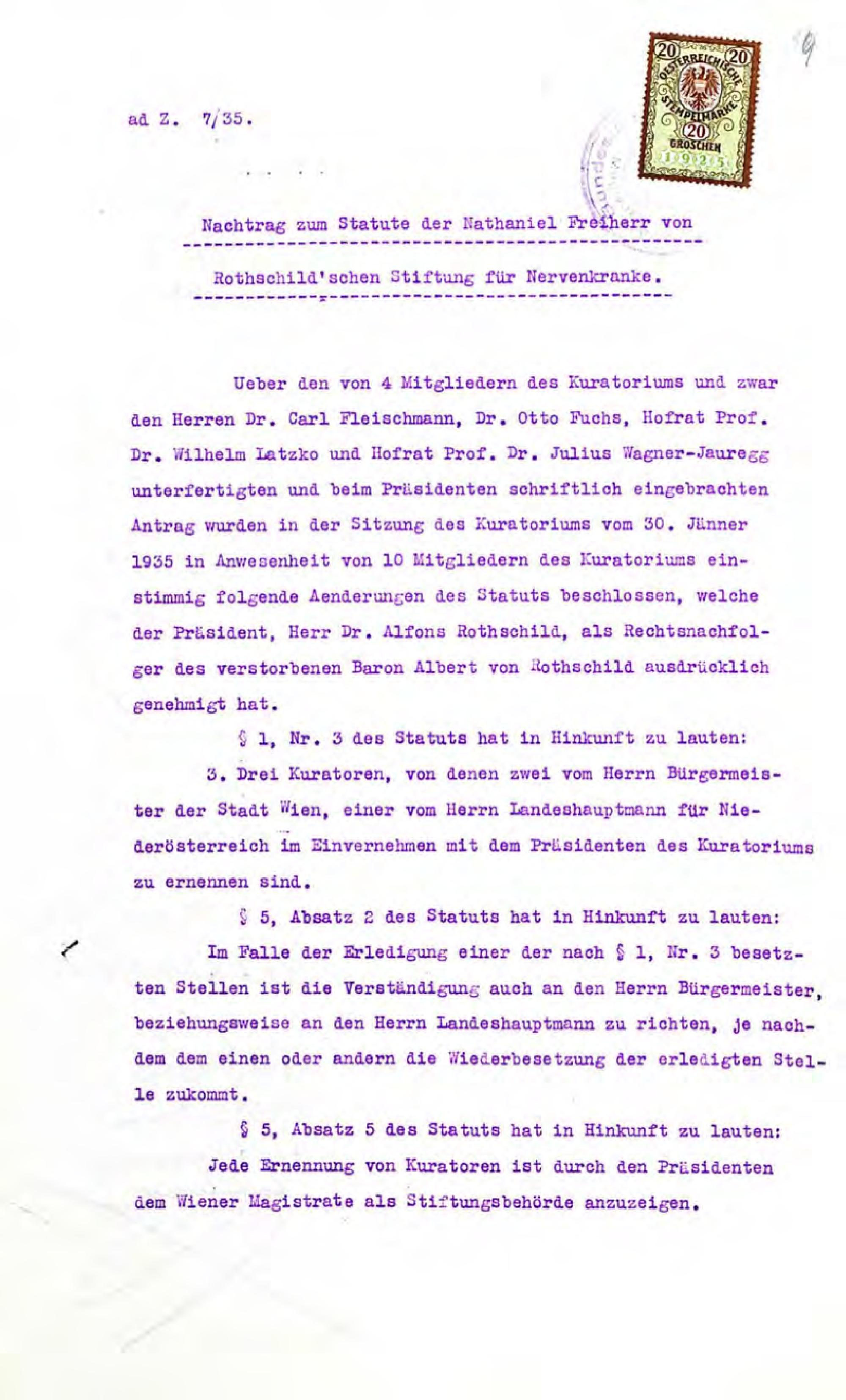 Geschichte der Nathaniel Freiherr von Rothschild’schen Stiftung für Nervenkranke von ihrer Errichtung bis zu ihrer Reorganisation in der Nachkriegszeit / erstellt im Auftrag der Geschäftsgruppen Soziales, Gesundheit und Sport (Stadtrat Peter Hacker) sowie Kultur und Wissenschaft (Stadträtin Veronica Kaup-Hasler) ; Univ. Prof.in Dr.in Ilse Reiter-Zatloukal (Leitung), Mag. Dr. Gerhard Baumgartner, Univ. Prof. DDr. Oliver Rathkolb, Univ. Prof. Dr. Roman Sandgruber, Dr.in Ulrike Zimmerl ; Projektkoordination: Dr.in Brigitte Rigele, MAS ; ProjektmitarbeiterInnen: Dr.in Verena Pawlowsky, Dr. Harald Wendelin vom Forschungsbüro. Verein für wissenschaftliche und kulturelle Dienstleistungen / Anhang