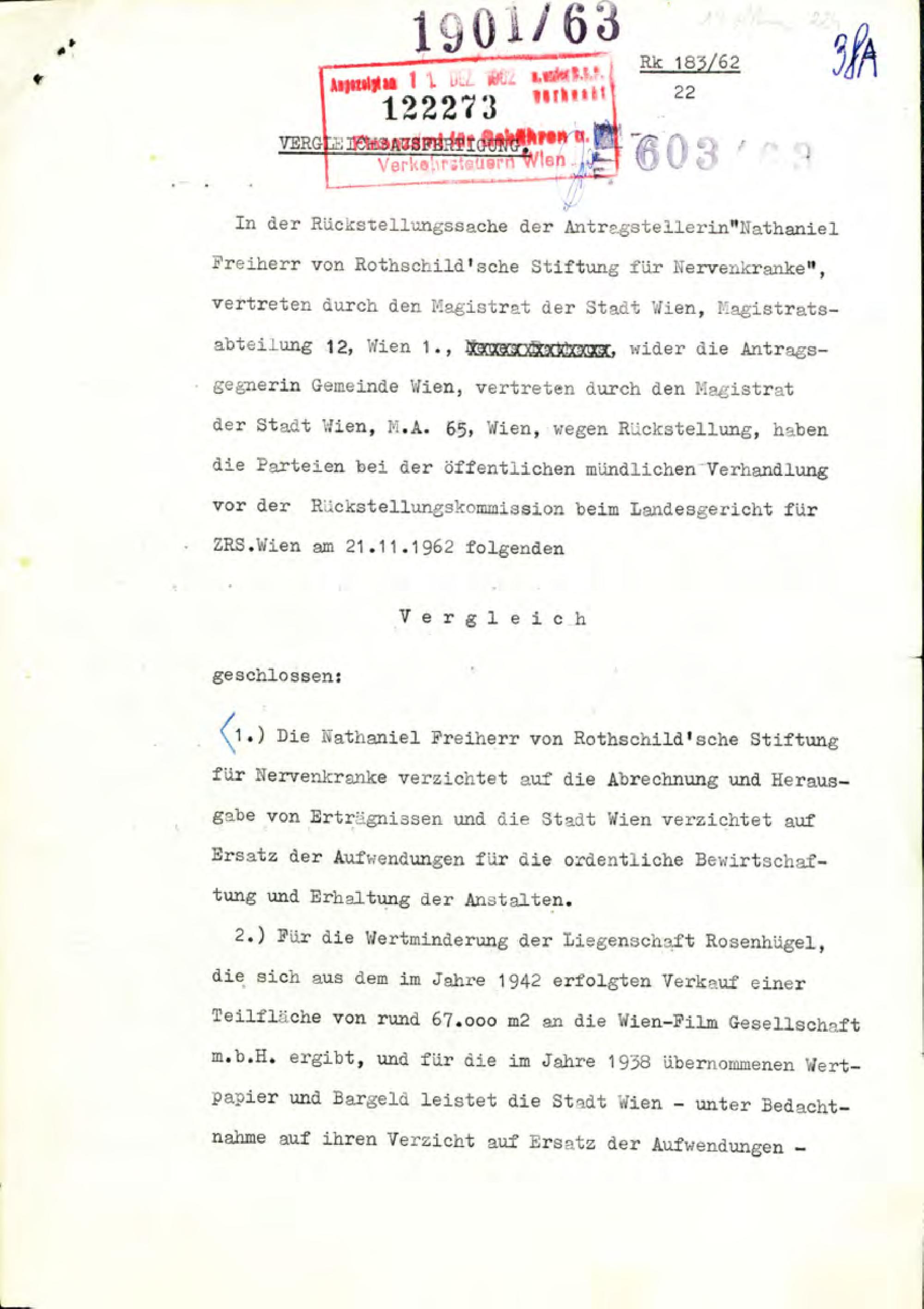 Geschichte der Nathaniel Freiherr von Rothschild’schen Stiftung für Nervenkranke von ihrer Errichtung bis zu ihrer Reorganisation in der Nachkriegszeit / erstellt im Auftrag der Geschäftsgruppen Soziales, Gesundheit und Sport (Stadtrat Peter Hacker) sowie Kultur und Wissenschaft (Stadträtin Veronica Kaup-Hasler) ; Univ. Prof.in Dr.in Ilse Reiter-Zatloukal (Leitung), Mag. Dr. Gerhard Baumgartner, Univ. Prof. DDr. Oliver Rathkolb, Univ. Prof. Dr. Roman Sandgruber, Dr.in Ulrike Zimmerl ; Projektkoordination: Dr.in Brigitte Rigele, MAS ; ProjektmitarbeiterInnen: Dr.in Verena Pawlowsky, Dr. Harald Wendelin vom Forschungsbüro. Verein für wissenschaftliche und kulturelle Dienstleistungen / Anhang
