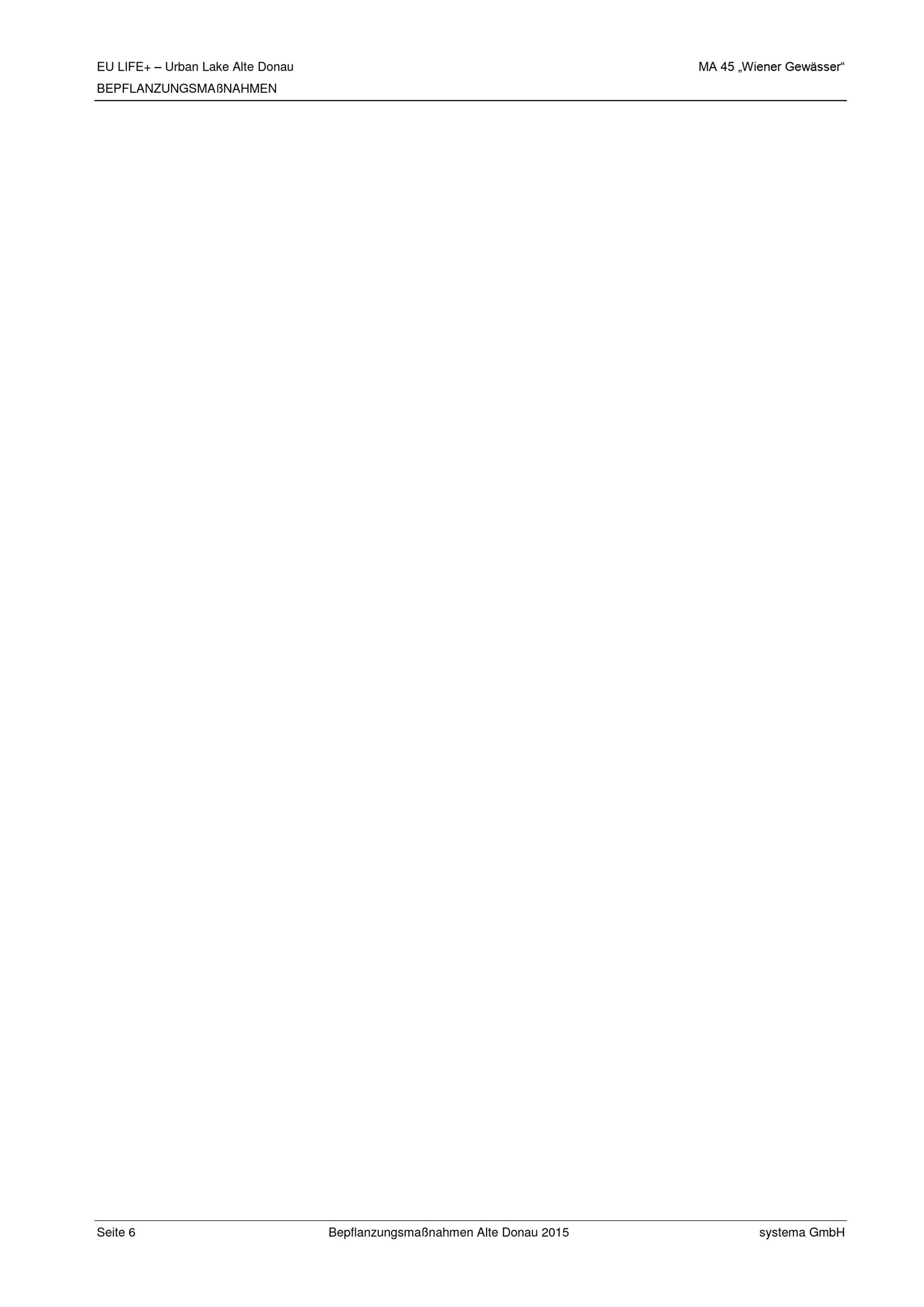 EU-LIFE+ Urban Lake Alte Donau : Bepflanzungsmaßnahmen 2015 zur Erhöhung der Biodiversität und zur Förderung der Ausbreitung niederwüchsiger Vegetation / Auftraggeber: Magistrat der Stadt Wien, Magistratsabteilung 45 - Wiener Gewässer ; Auftragnehmer: Systema Bio- und Management Consulting GmbH ; Verfasser: Karin Pall, Stefan Mayerhofer
