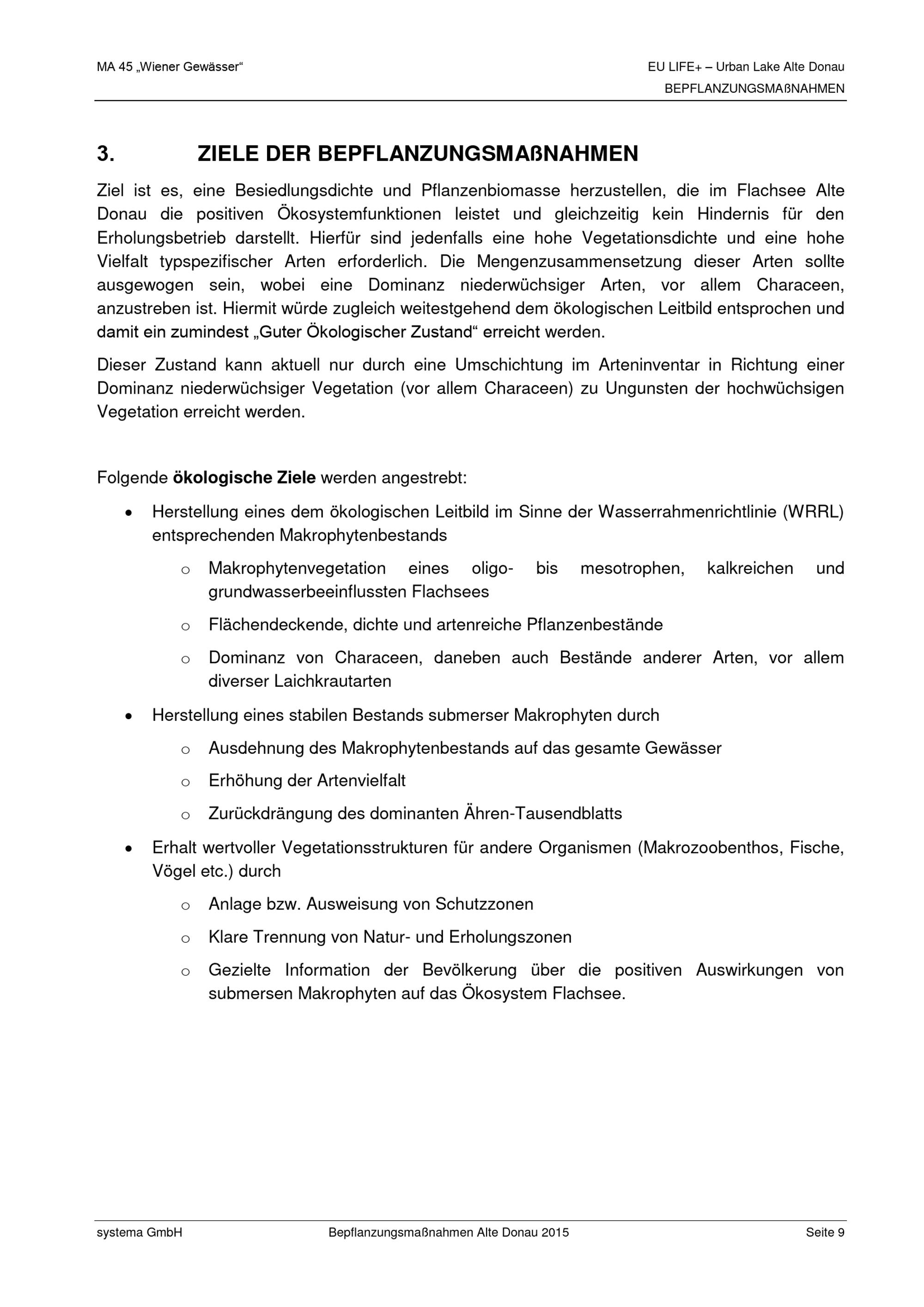 EU-LIFE+ Urban Lake Alte Donau : Bepflanzungsmaßnahmen 2015 zur Erhöhung der Biodiversität und zur Förderung der Ausbreitung niederwüchsiger Vegetation / Auftraggeber: Magistrat der Stadt Wien, Magistratsabteilung 45 - Wiener Gewässer ; Auftragnehmer: Systema Bio- und Management Consulting GmbH ; Verfasser: Karin Pall, Stefan Mayerhofer