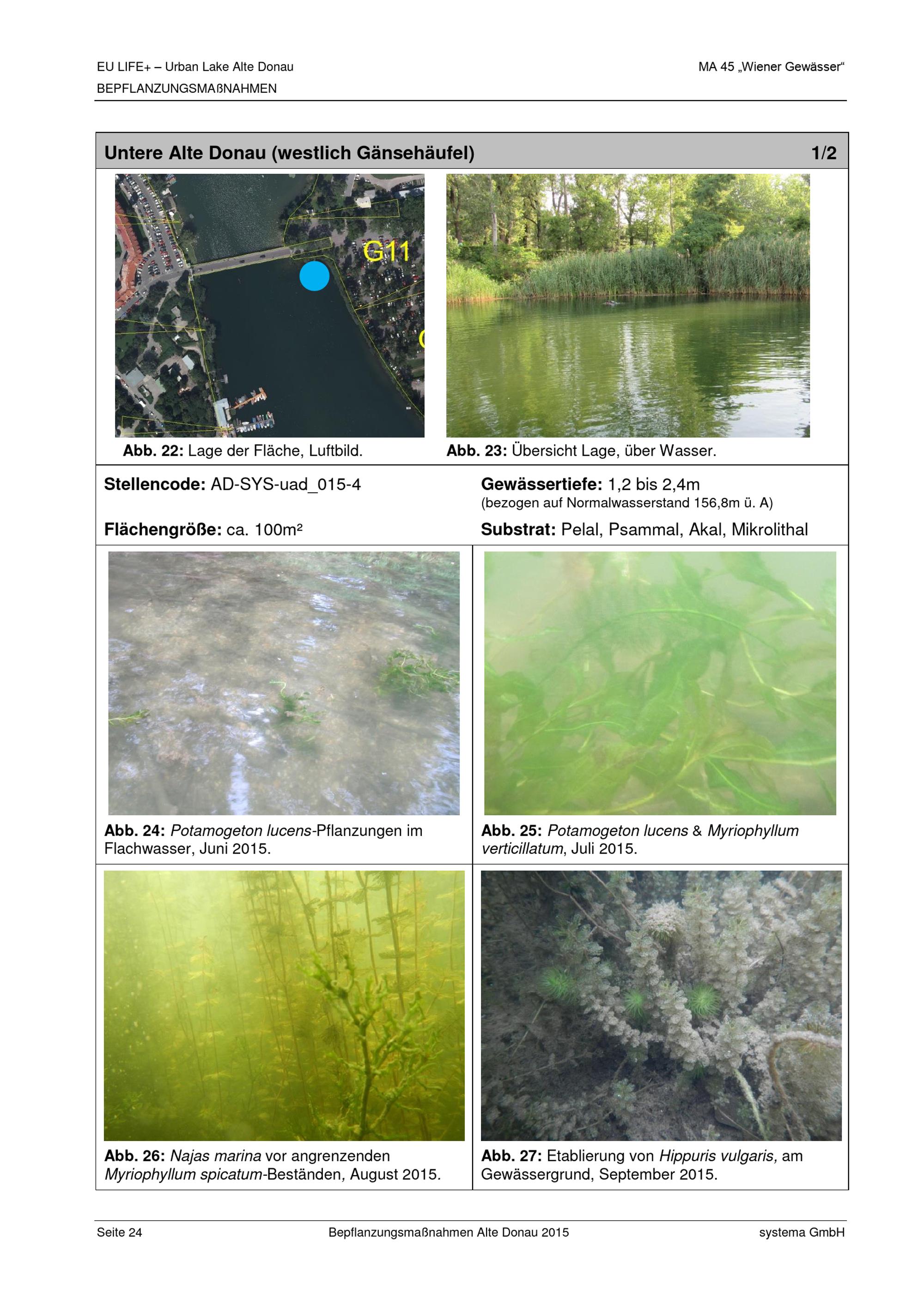 EU-LIFE+ Urban Lake Alte Donau : Bepflanzungsmaßnahmen 2015 zur Erhöhung der Biodiversität und zur Förderung der Ausbreitung niederwüchsiger Vegetation / Auftraggeber: Magistrat der Stadt Wien, Magistratsabteilung 45 - Wiener Gewässer ; Auftragnehmer: Systema Bio- und Management Consulting GmbH ; Verfasser: Karin Pall, Stefan Mayerhofer