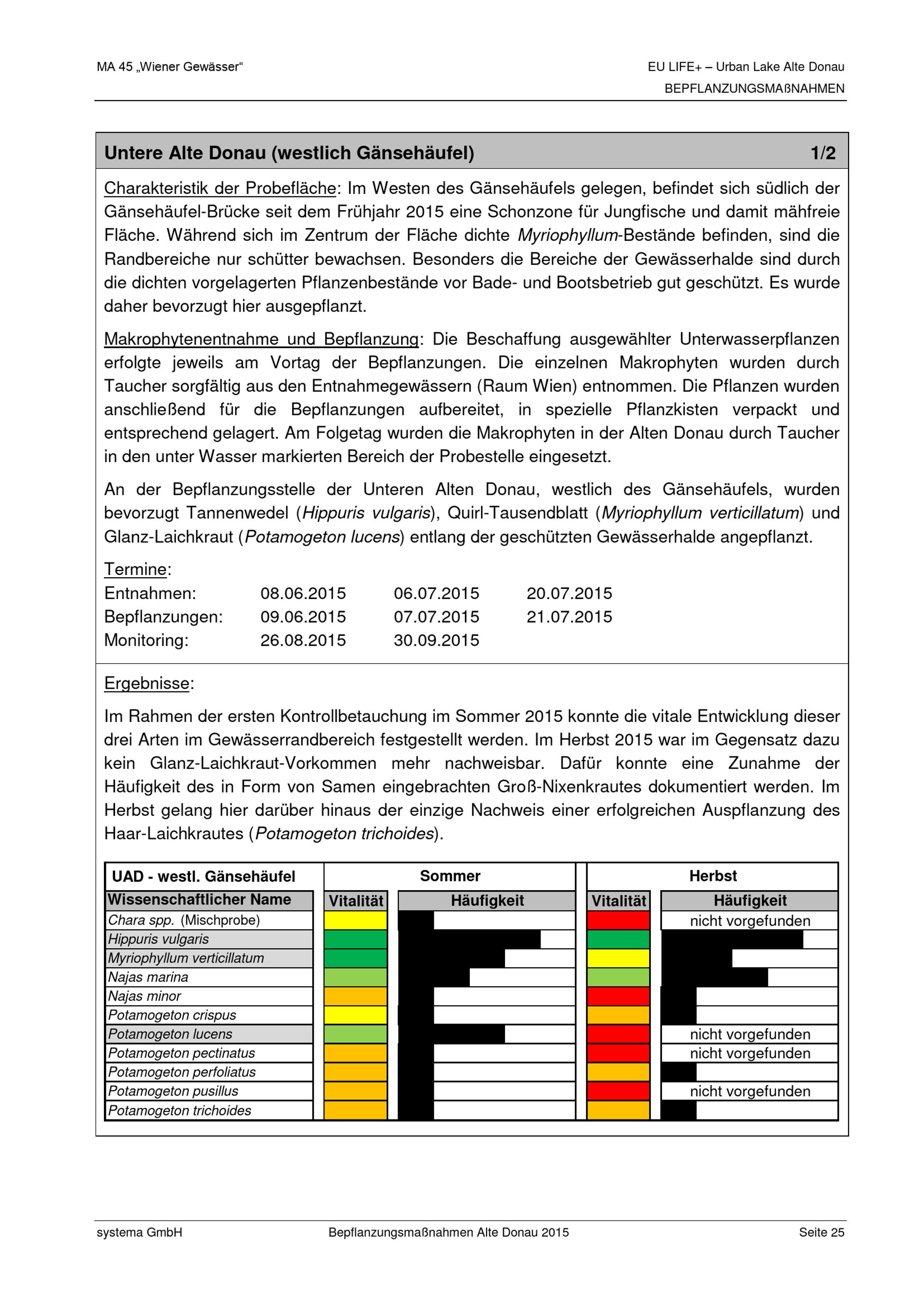 EU-LIFE+ Urban Lake Alte Donau : Bepflanzungsmaßnahmen 2015 zur Erhöhung der Biodiversität und zur Förderung der Ausbreitung niederwüchsiger Vegetation / Auftraggeber: Magistrat der Stadt Wien, Magistratsabteilung 45 - Wiener Gewässer ; Auftragnehmer: Systema Bio- und Management Consulting GmbH ; Verfasser: Karin Pall, Stefan Mayerhofer
