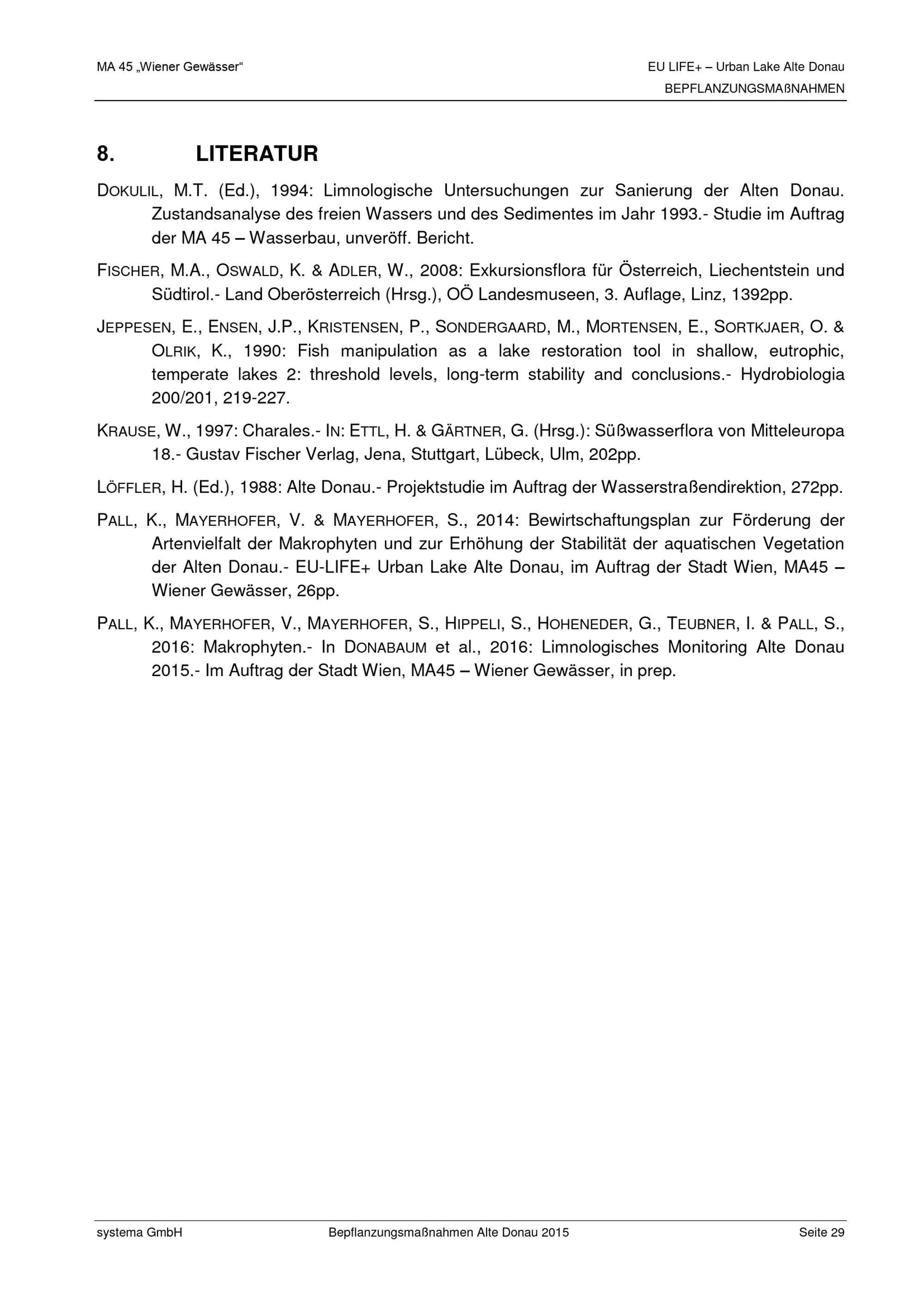 EU-LIFE+ Urban Lake Alte Donau : Bepflanzungsmaßnahmen 2015 zur Erhöhung der Biodiversität und zur Förderung der Ausbreitung niederwüchsiger Vegetation / Auftraggeber: Magistrat der Stadt Wien, Magistratsabteilung 45 - Wiener Gewässer ; Auftragnehmer: Systema Bio- und Management Consulting GmbH ; Verfasser: Karin Pall, Stefan Mayerhofer