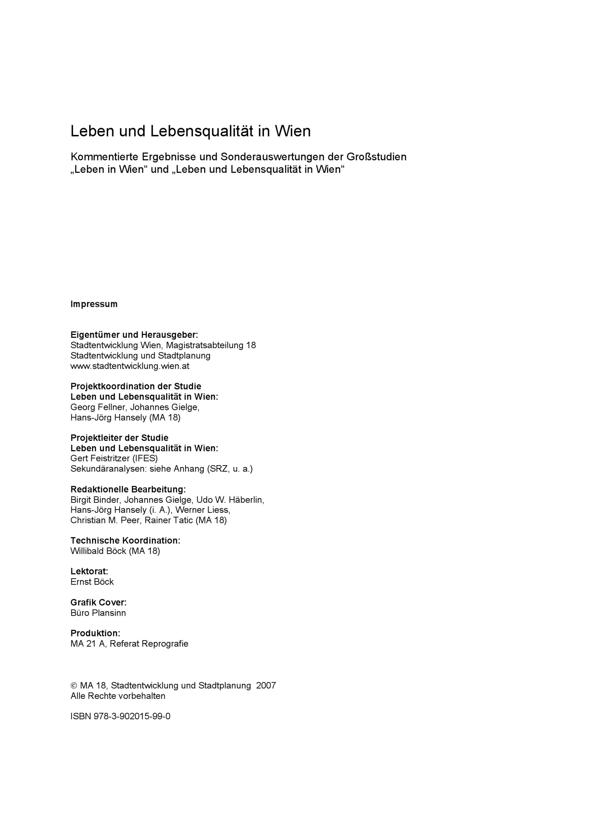 Leben und Lebensqualität in Wien : kommentierte Ergebnisse und Sonderauswertungen der Großstudien "Leben in Wien" und "Leben und Lebensqualität in Wien" / Eigentümer und Herausgeber: Stadtentwicklung Wien, Magistratsabteilung 18 Stadtentwicklung und Stadtplanung ; Projektkoordination der Studie Leben und Lebensqualität in Wien: Georg Fellner, Johannes Gielge, Hans-Jörg Hansely (MA 18) ; Projektleiter der Studie Leben und Lebensqualität in Wien: Gert Feistritzer (IFES)