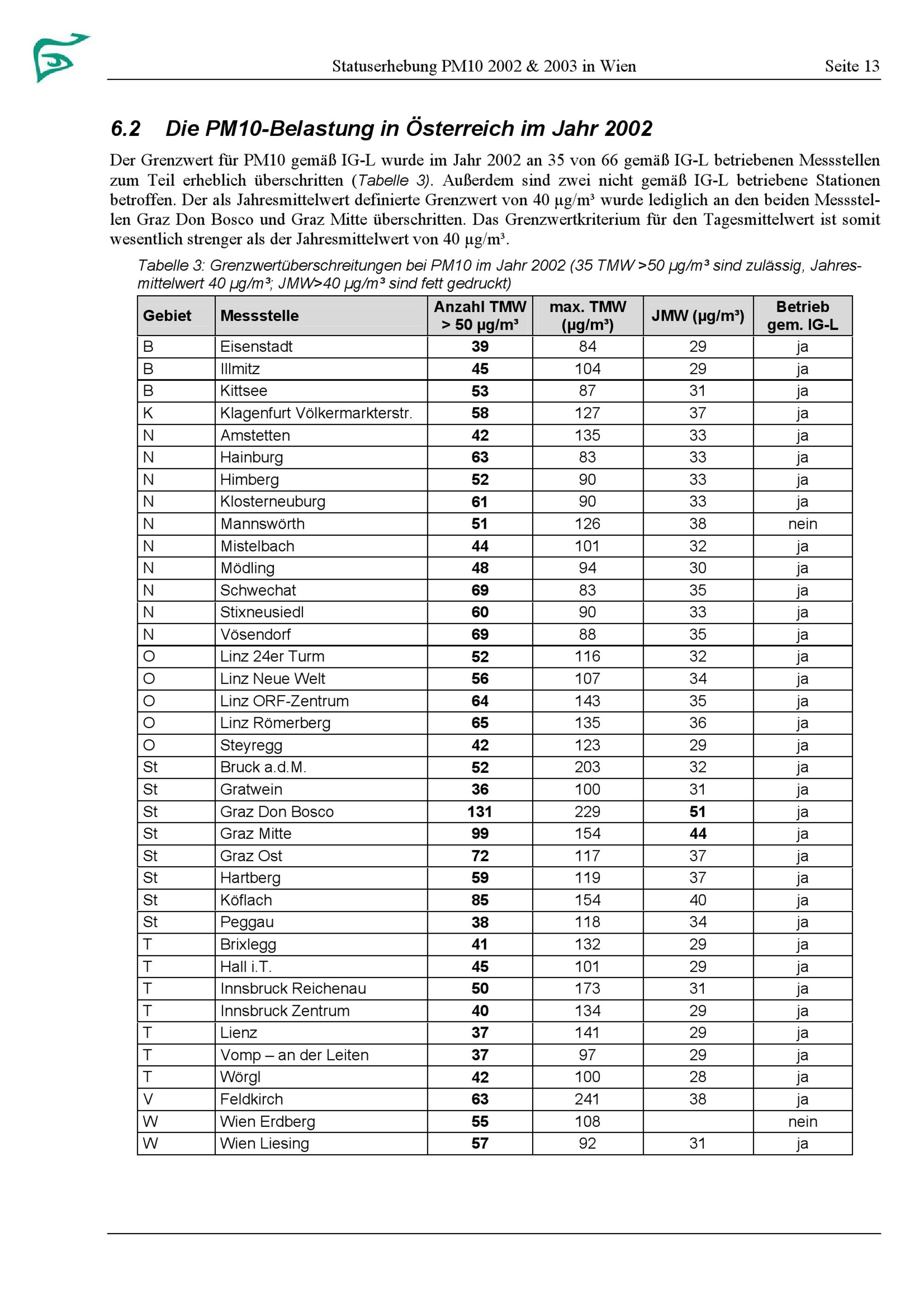 Statuserhebung PM10 2002 & 2003 in Wien : gemäß Immissionsschutzgesetz - Luft : basierend auf einer Studie des Umweltbundesamtes / Roman Augustyn [und 3 weitere] ; MA 22 - Umweltschutz