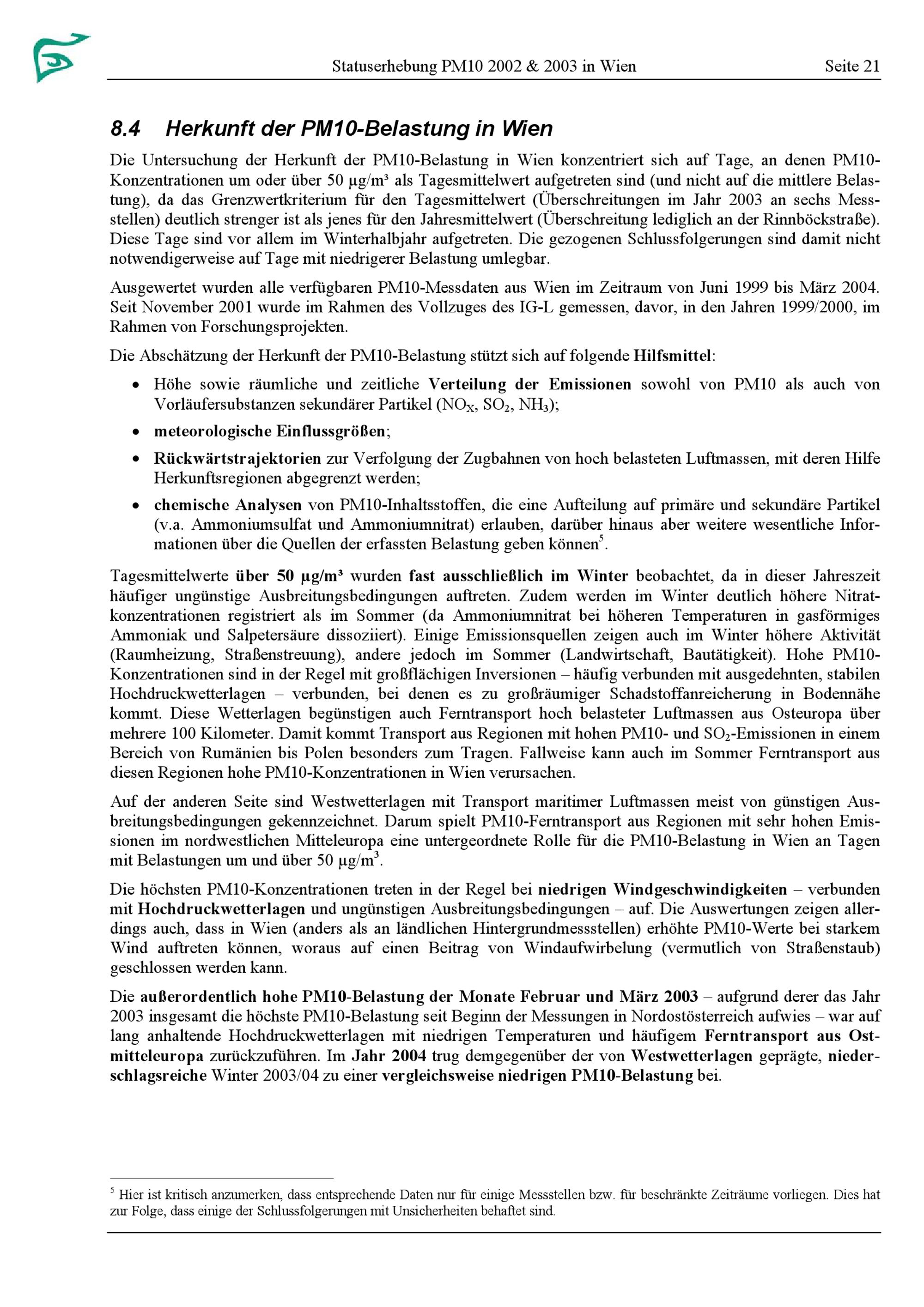 Statuserhebung PM10 2002 & 2003 in Wien : gemäß Immissionsschutzgesetz - Luft : basierend auf einer Studie des Umweltbundesamtes / Roman Augustyn [und 3 weitere] ; MA 22 - Umweltschutz
