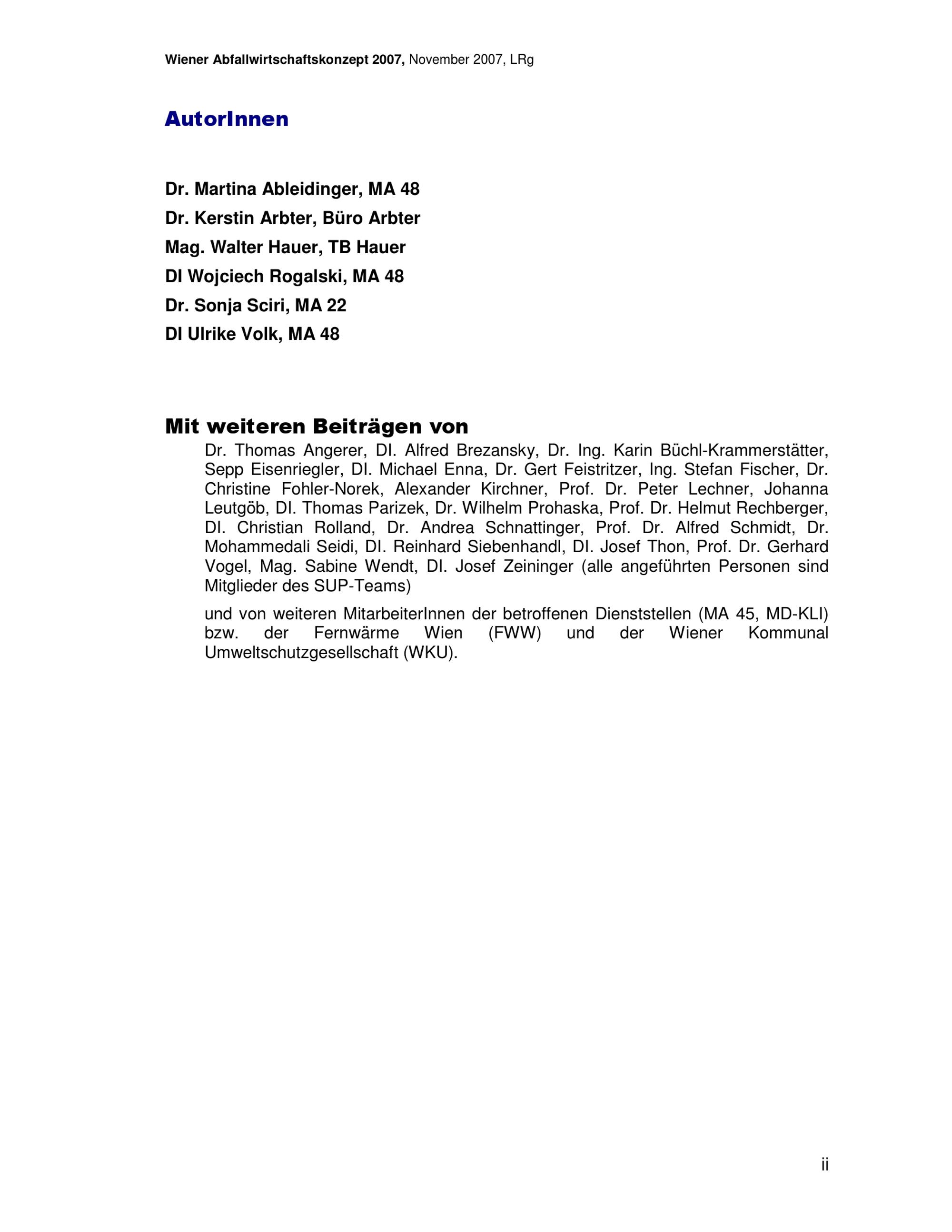 Wiener Abfallwirtschaftskonzept 2007 : im Rahmen der strategischen Umweltprüfung 2006/07 / Magistratsabteilung 48 - Abfallwirtschaft Straßenreinigung und Fuhrpark ; Autorinnen: Martina Ableidinger, Kerstin Arbter, Walter Hauer [und 3 weitere]
