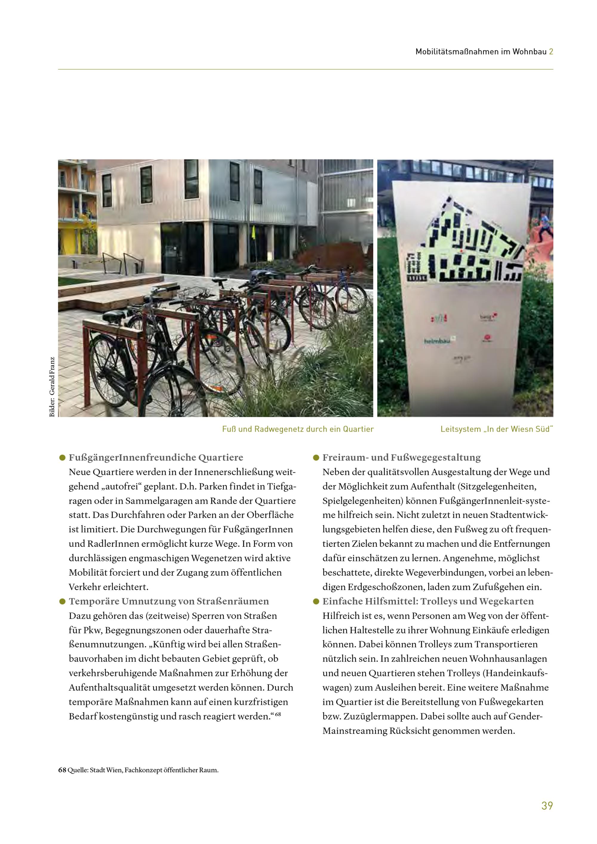 Leitfaden Mobilitätsmaßnahmen im Wohnbau : Übersicht und Planungsempfehlungen für Wohnbauvorhaben in Wien / Stadt Wien - Stadtteilplanung und Flächenwidmung ; Projektleitung und inhaltliche Erarbeitung: Mag. Gerald Franz, MA (Urban Innovation Vienna) ; inhaltliche Begleitung: DI Alexandra Madreiter (Stadtteilplanung und Flächenwidmung (MA 21) ; Mitarbeit: Mag. Judith Neyer (Urban Innovation Vienna), Carolin Monsberger, BSc (Urban Innovation Vienna), DI Alexander Scholz (Urban Innovation Vienna)