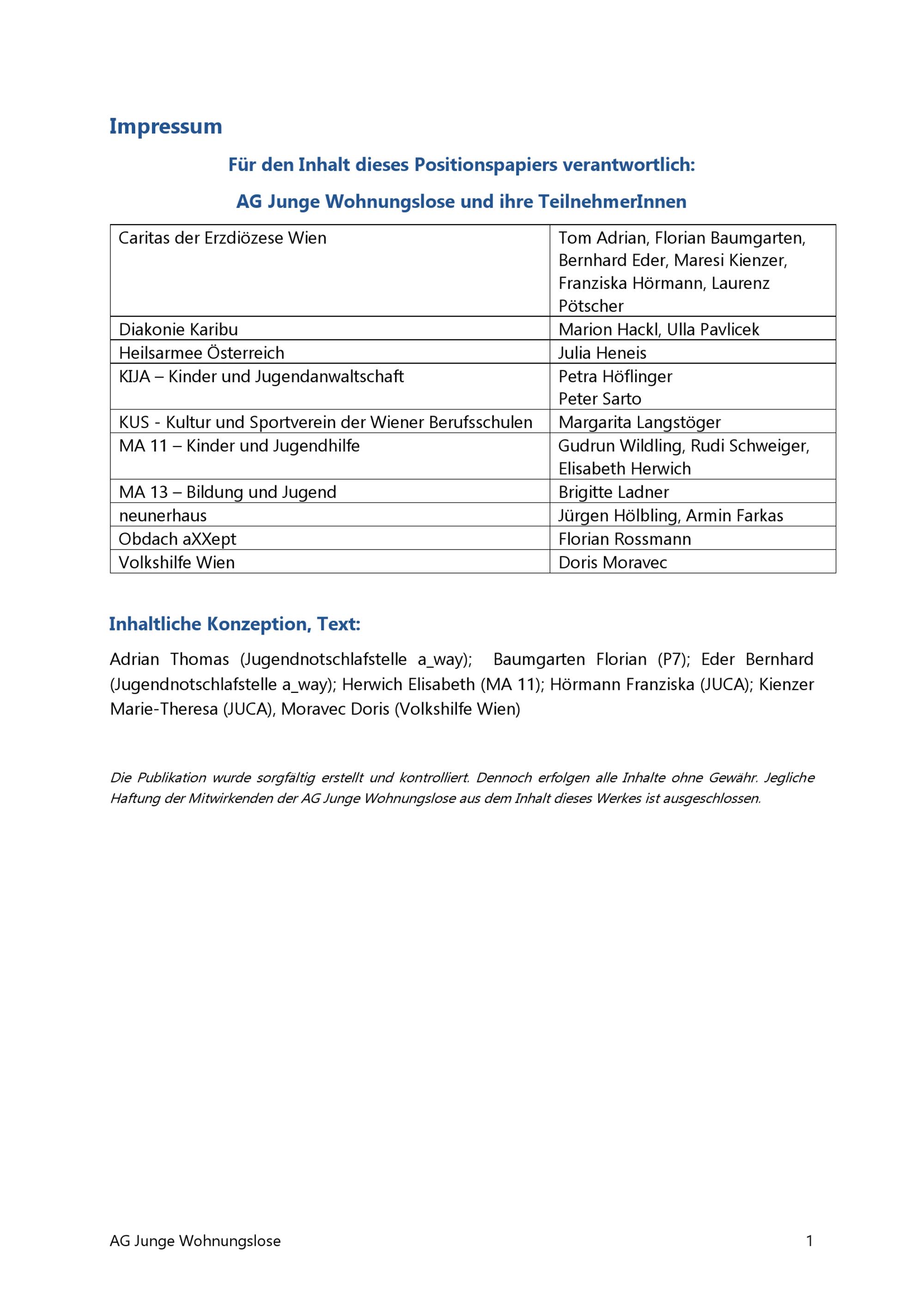 Über den Bedarf eines Gesamtkonzepts für junge Erwachsene in der Wohnungslosenhilfe : Positionspapier der AG Junge Wohnungslose / AG Junge Wohnungslose ; inhaltliche Konzeption, Text: Adrian Thomas (Jugendnotschlafstelle a_way), Baumgarten Florian (P7), Eder Bernhard (Jugendnotschlafstelle a_way) [und 4 weitere]