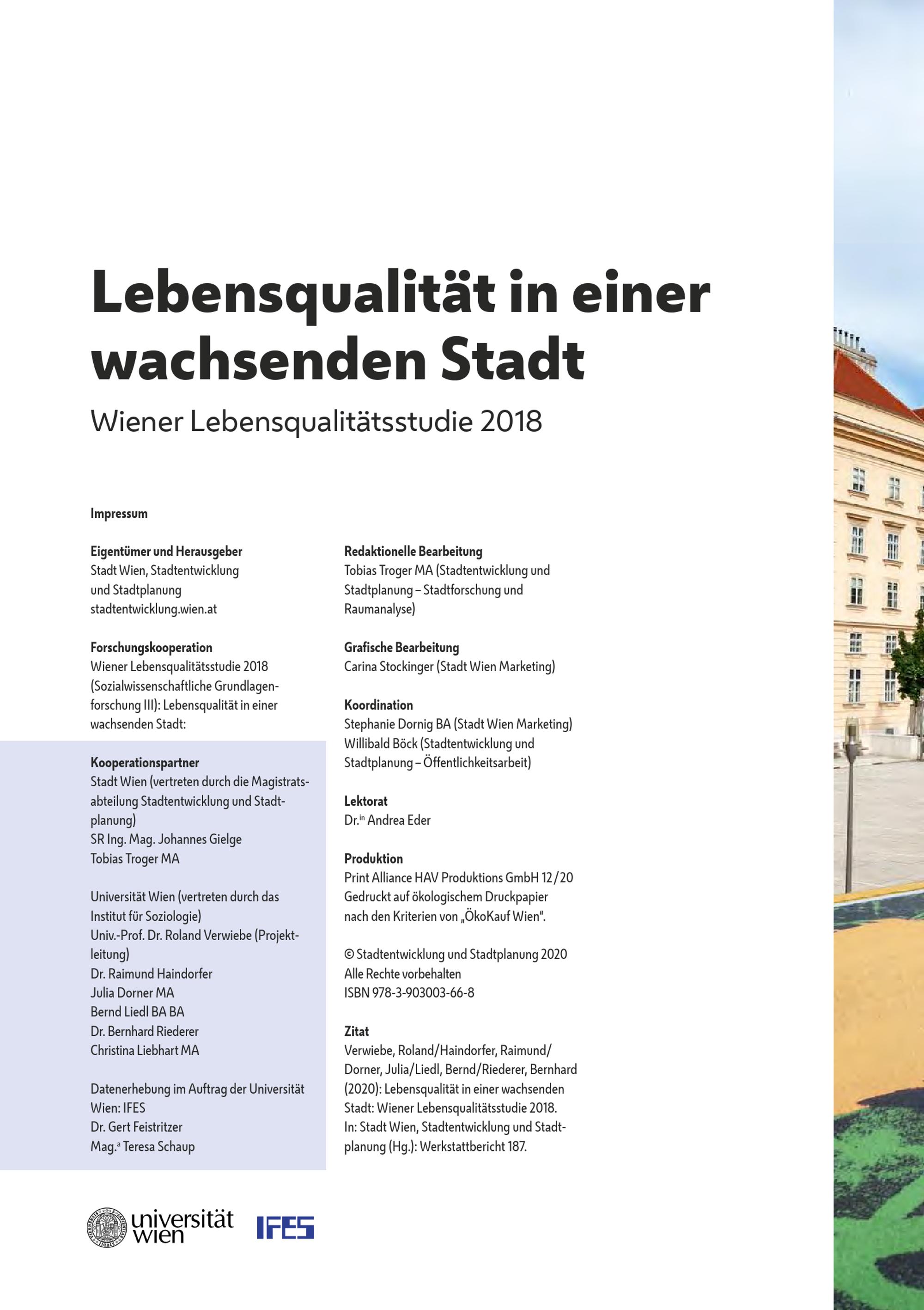 Lebensqualität in einer wachsenden Stadt : Wiener Lebensqualitätsstudie 2018 / Stadt Wien, Stadtentwicklung und Stadtplanung ; Redaktionelle Bearbeitung: Tobias Troger, MA 18 ; Inhalt und Redaktion: Magistratsabteilung 18 - Stadtentwicklung und Stadtplanung, Universität Wien (vertreten durch das Institut für Soziologie) ; Projektleitung: Roland Verwiebe