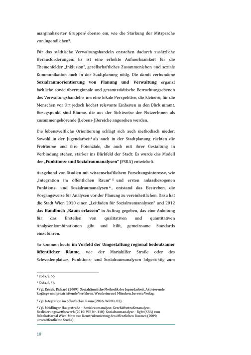 Die Wiener Praxis der Funktions- und Sozialraumanalysen : Praxisbeispiele und Einsatzbereiche - Gegenüberstellung von Analysen des öffentlichen Raums in der City und zweier Wohngebiete in unterschiedlichen Siedlungstypen / Eigentümerin und Herausgeberin: Stadtentwicklung Wien, Magistratsabteilung 18 - Stadtentwicklung und Stadtplanung ; Konzeption und Projektleitung: kon-text, Ingenieurbüro für Raumplanung: Andrea Breitfuss, Sabine Löw ; VerfasserInnen und ProjektmitarbeiterInnen: kon-text, Ingenieurbüro für Raumplanung: Andrea Breitfuss [und 4 weiteren]