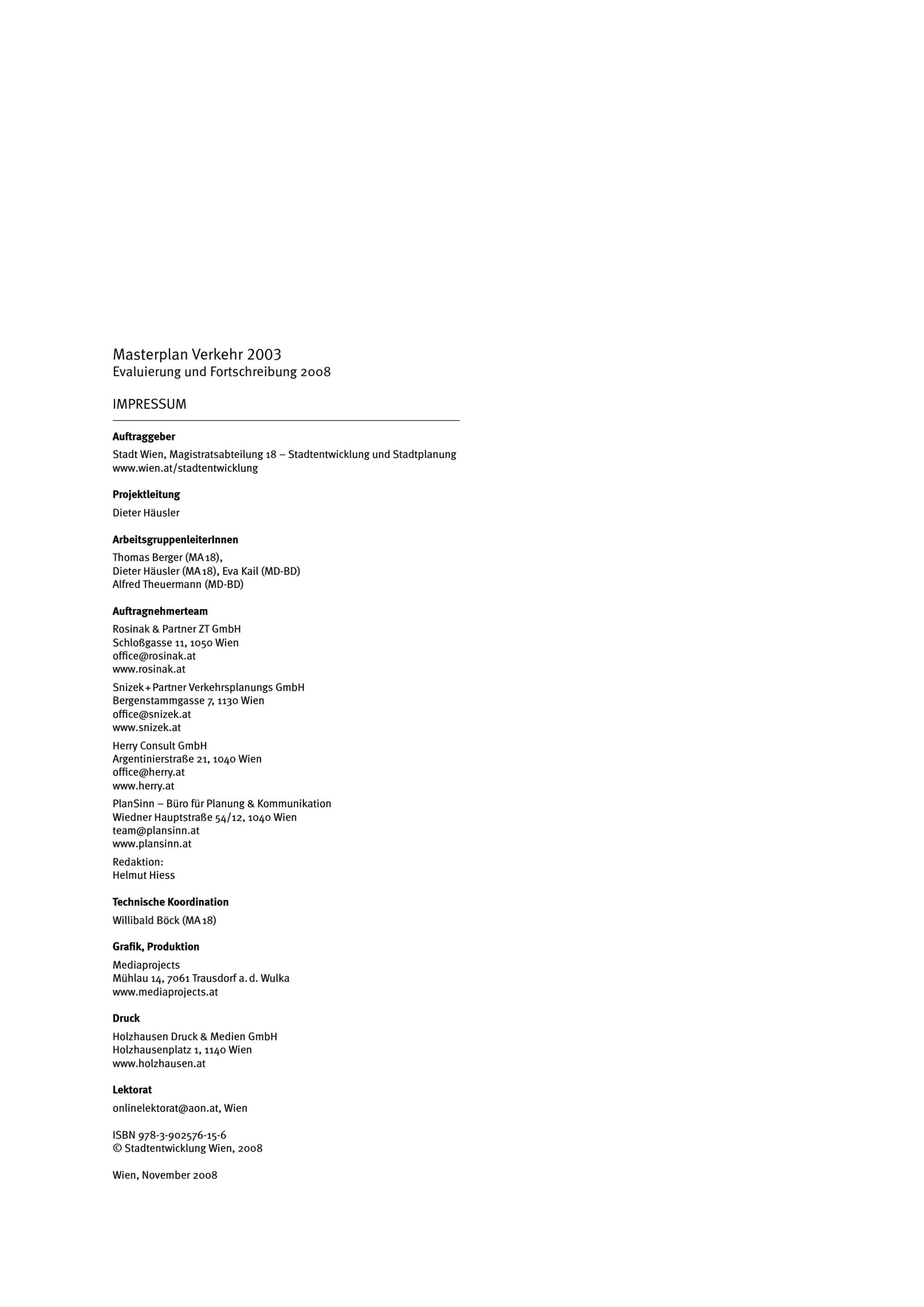 Masterplan Verkehr 2003 : Evaluierung und Fortschreibung 2008 ; die Evaluierung und Fortschreibung des Masterplan Verkehr 2003 wurde am 19. Dezember 2008 von Wiener Gemeinderat beschlossen ; Mobil in Wien, Masterplan Verkehr 03/08 / Herausgeber: Magistratsabteilung 18 - Stadtentwicklung und Stadtplanung ; Projektleitung: Dieter Häusler ; Auftragnehmerteam: Rosinak & Partner ZT GmbH [und 3 weitere]