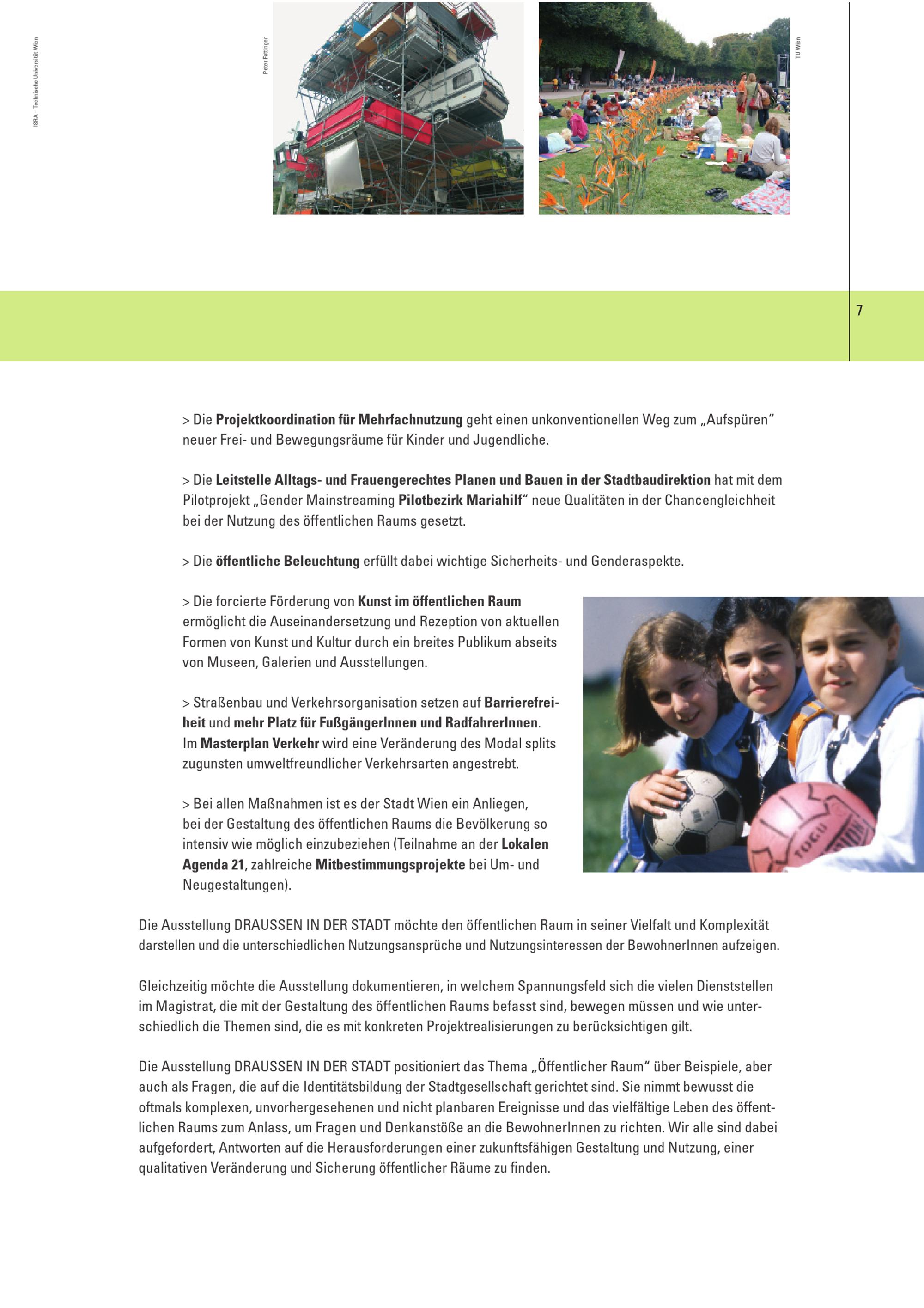 Draussen in der Stadt : öffentliche Räume in Wien ; Werkstattbericht anlässlich der gleichnamigen Eröffnungsausstellung in der Wiener Planungswerkstatt, 13. September bis 14. Dezember 2007 / Herausgeber: Magistratsabteilung 18 - Stadtentwicklung und Stadtplanung ; Ausstellungskonzeption und inhaltliche Bearbeitung: Brigitte Lacina [und 3 weitere] ; Mit Textbeiträgen von: Nina Chladek-Danklmaier [und 21 weitere]