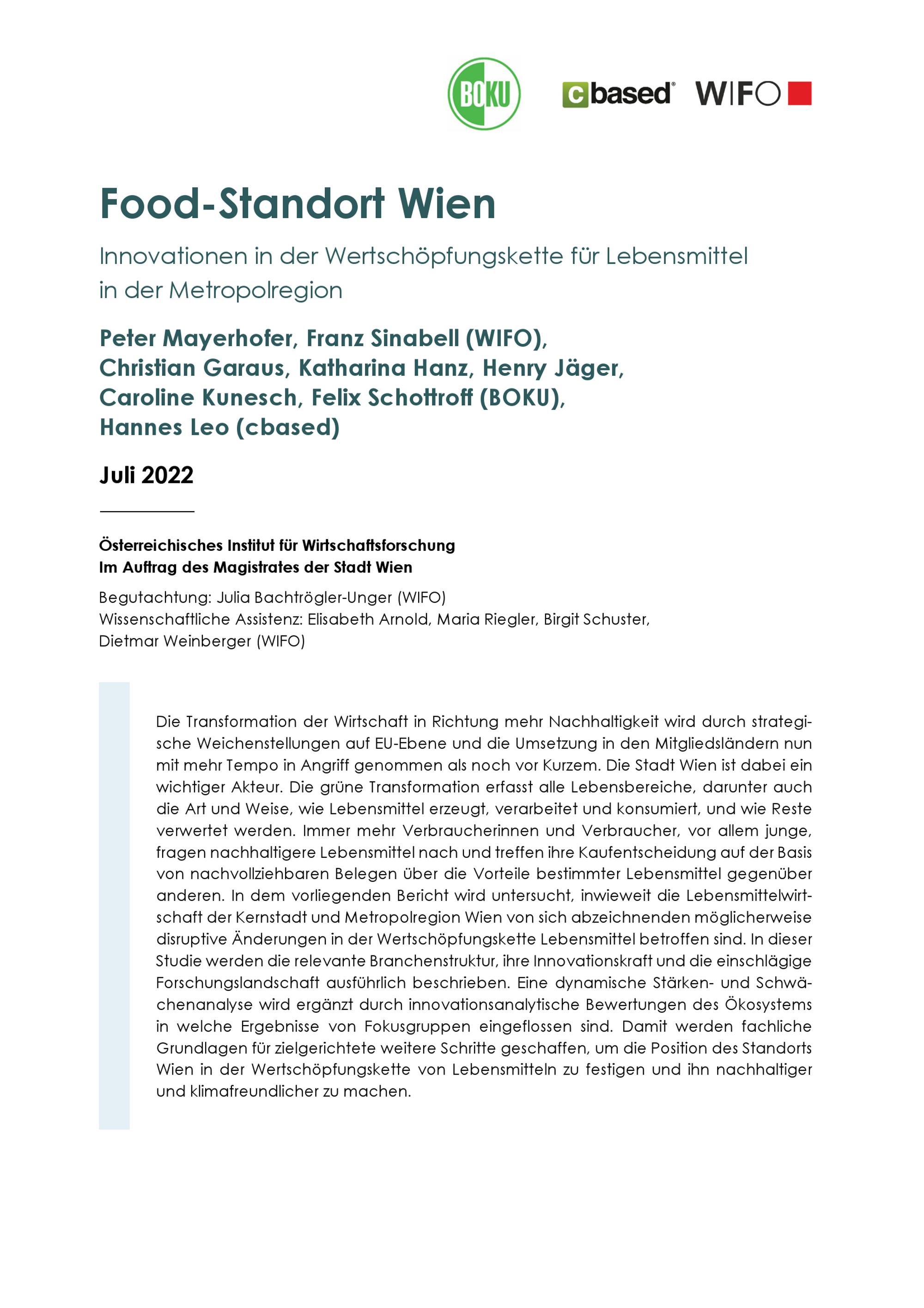 Food-Standort Wien : Innovationen in der Wertschöpfungskette für Lebensmittel in der Metropolregion / Peter Mayerhofer, Franz Sinabell, Christian Garaus [und 5 weitere] ; Österreichisches Institut für Wirtschaftsforschung ; im Auftrag des Magistrates der Stadt Wien