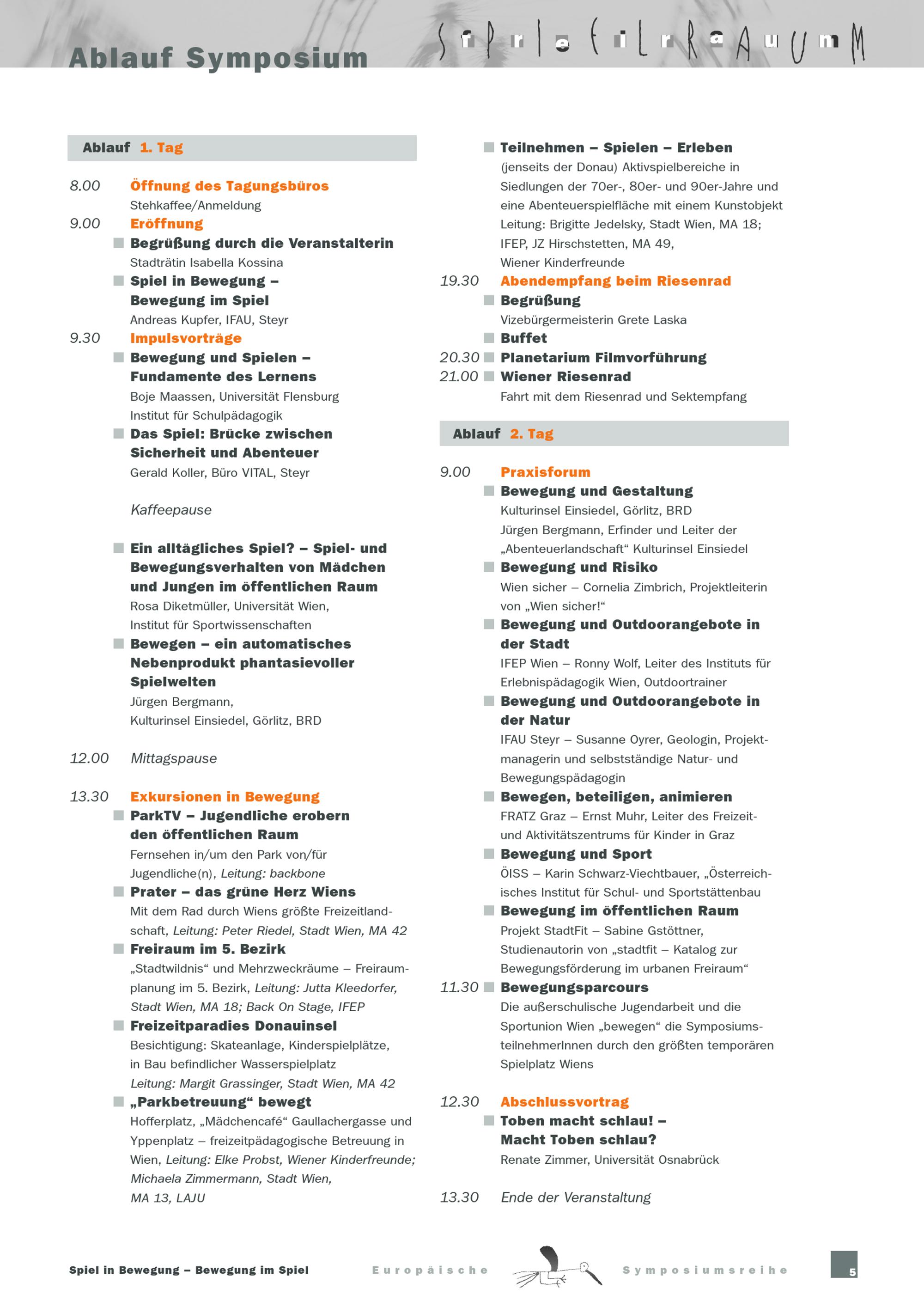 Spiel in Bewegung - Bewegung im Spiel : 3. und 4. Juni 2004 ; Wiener Prater, Riesenrad, Kaisergarten und Planetarium ; [Spielraumsymposium 2004] / Herausgeber: Magistratsabteilung 18 - Stadtplanung und Stadtentwicklung ; Inhaltliche Bearbeitung: Andreas Kupfer