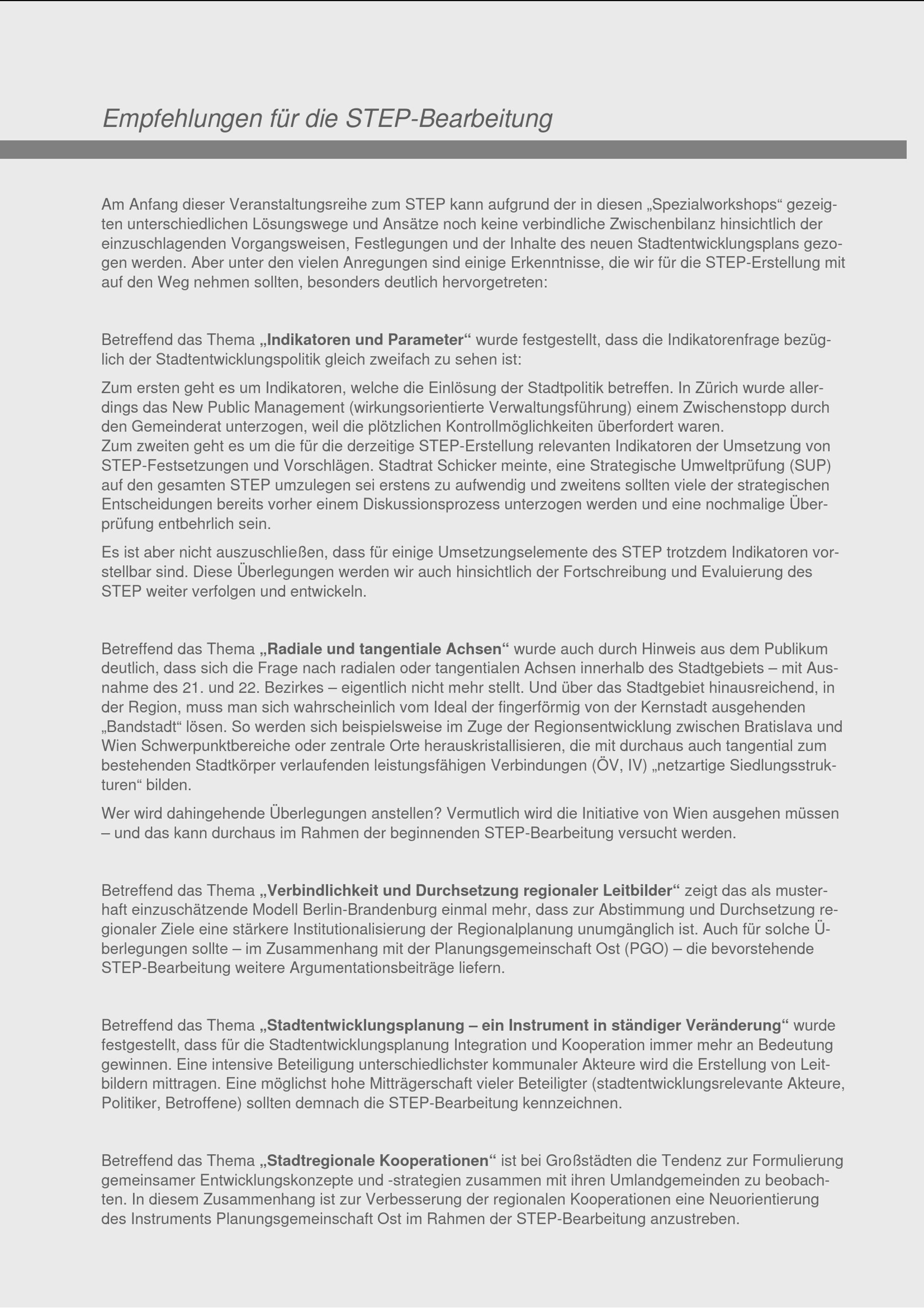 Stadtregionen - Steuerungsmöglichkeiten für die räumliche Entwicklung : Dokumentation der STEP-Workshops ; Start-Workshop 18. Juni 2002: "Neue Formen verbindlicher Vorgaben für eine Stadtregion" ; Workshop "STEP - heute" 13. Dezember 2002: "Veränderungen in der Stadtentwicklungsplanung und Möglichkeiten stadtregionaler Kooperationen" / Herausgeber: Magistratsabteilung 18 - Stadtentwicklung und Stadtplanung ; Redaktionelle Bearbeitung, Layout: Tanja Hanzl [und 2 weitere]