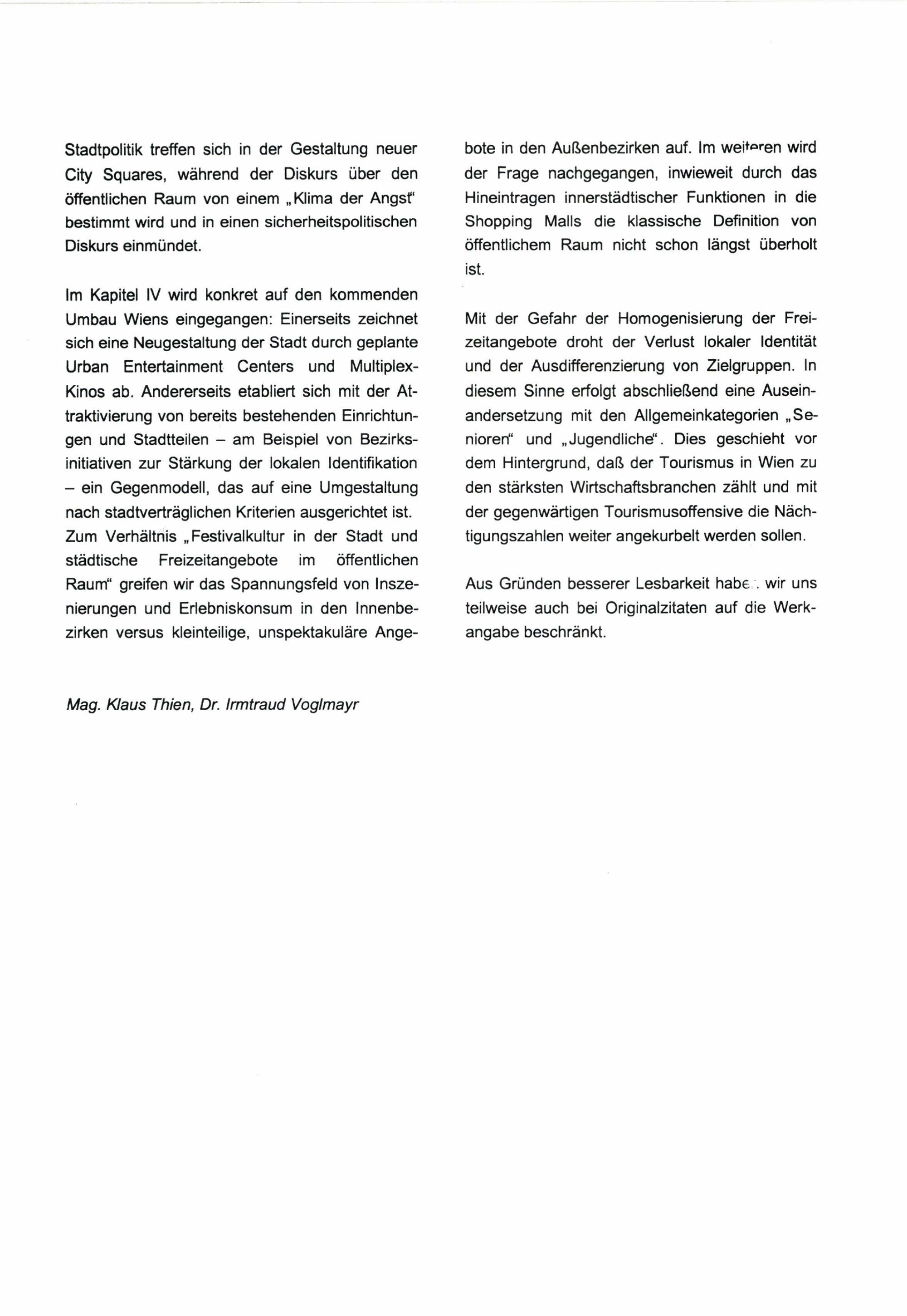 Urbane Strukturen und neue Freizeittrends : überarbeitete Publikation der gleichnamigen - im Auftrag der Stadtplanung Wien, Magistratsabteilung 18 erstellten - Studie / Herausgeber: Magistratsabteilung 18 - Stadtplanung ; AutorInnen: Klaus Thien ; Irmtraud Voglmayr