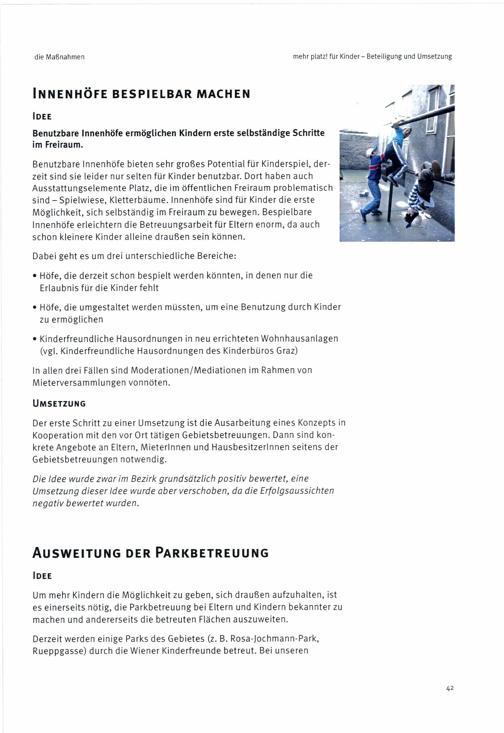 Mehr Platz! für Kinder : Beteiligung und Umsetzung - Pilotprojekt Leopoldstadt ; durchgeführt von PlanSinn im Auftrag der MA 18 - Stadtentwicklung / Herausgeber: Magistratsabteilung 18 - Stadtentwicklung und Stadtplanung ; Inhalt, Konzeption und Redaktion: Hanna Posch [und 1 weitere]