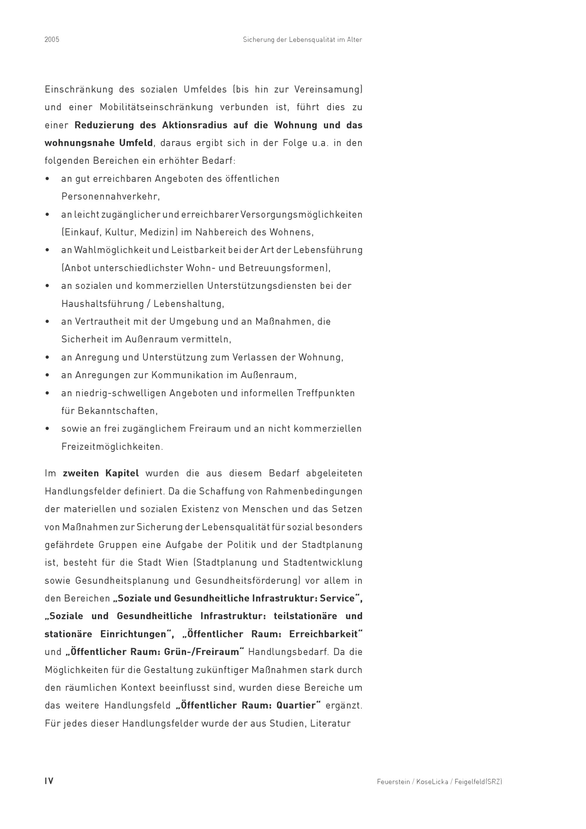 Sicherung der Lebensqualität im Alter : Stadtentwicklung und Stadtplanung / Auftraggeber: MA 18 Referat Landschaftsplanung und Projektmanagement in Zusammenarbeit mit dem Referat Stadtforschung und Trendanalysen und die Bereichsleitung für Sozial- und Gesundheitsplanung sowie Finanzmanagement ; Auftragnehmer: Arge Feuerstein - KoseLicka - SRZ