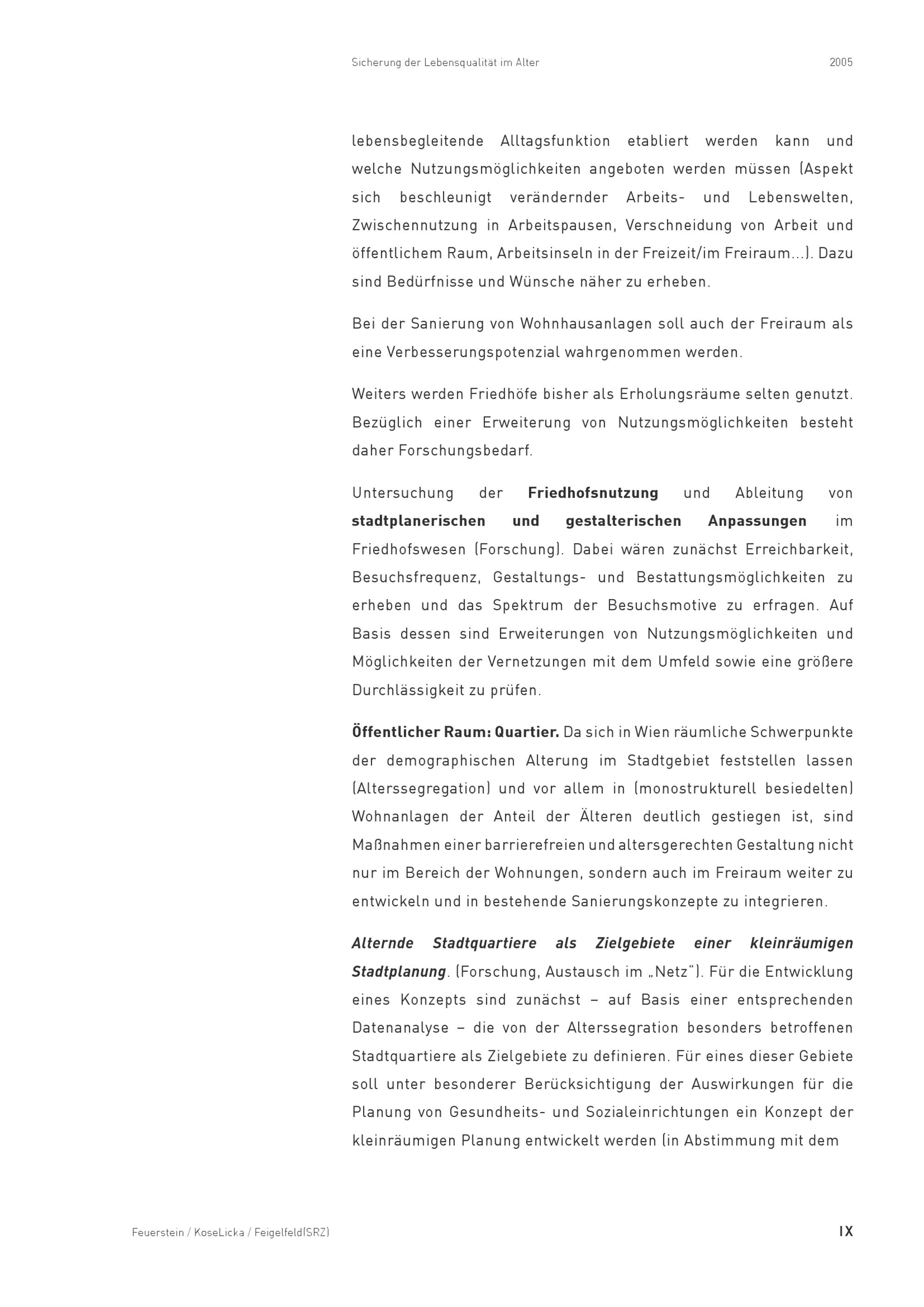 Sicherung der Lebensqualität im Alter : Stadtentwicklung und Stadtplanung / Auftraggeber: MA 18 Referat Landschaftsplanung und Projektmanagement in Zusammenarbeit mit dem Referat Stadtforschung und Trendanalysen und die Bereichsleitung für Sozial- und Gesundheitsplanung sowie Finanzmanagement ; Auftragnehmer: Arge Feuerstein - KoseLicka - SRZ