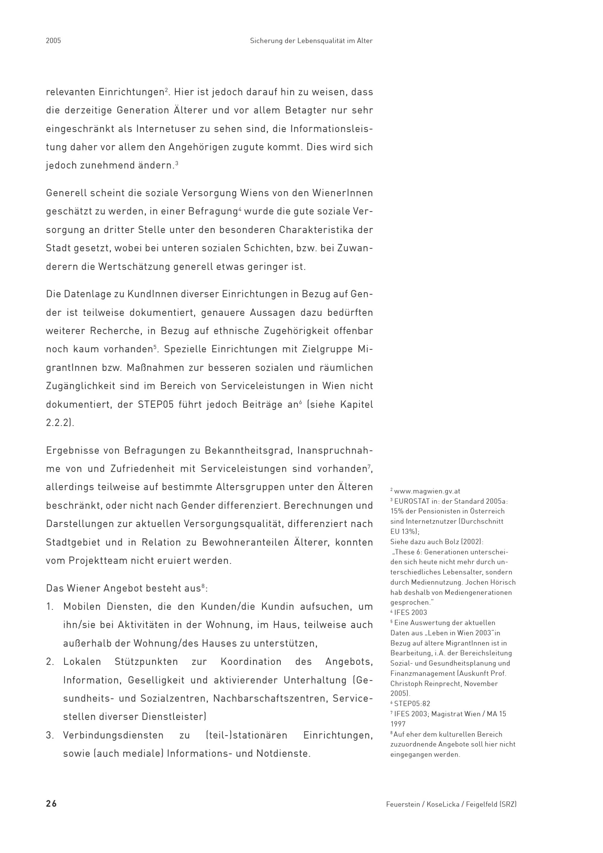 Sicherung der Lebensqualität im Alter : Stadtentwicklung und Stadtplanung / Auftraggeber: MA 18 Referat Landschaftsplanung und Projektmanagement in Zusammenarbeit mit dem Referat Stadtforschung und Trendanalysen und die Bereichsleitung für Sozial- und Gesundheitsplanung sowie Finanzmanagement ; Auftragnehmer: Arge Feuerstein - KoseLicka - SRZ