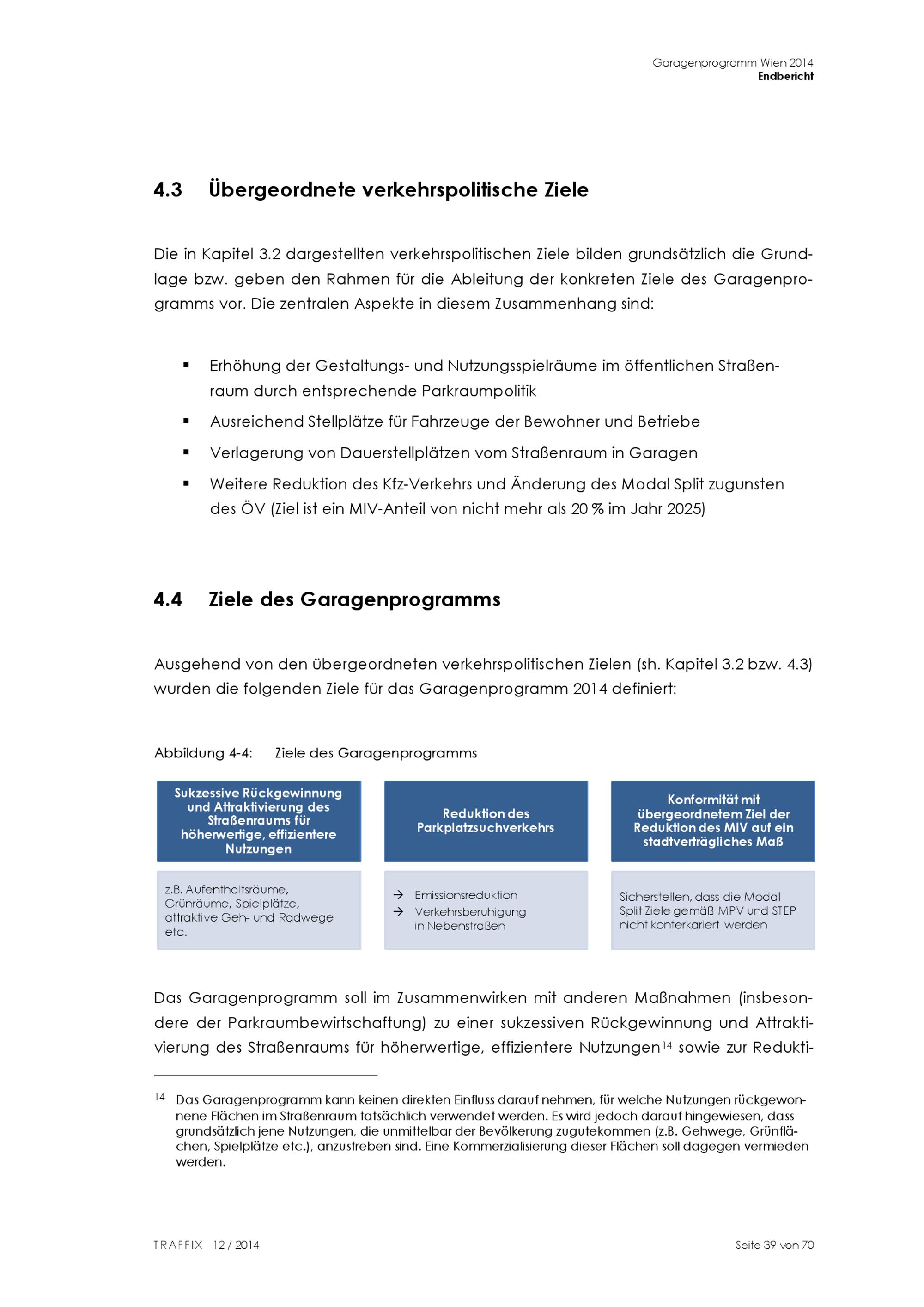 Garagenförderung in Wien : Garagenprogramm 2014 : Endbericht / Auftraggeber: Magistrat der Stadt Wien MA 18 - Stadtentwicklung und Stadtplanung vertreten durch: Dipl.-Ing. Roman Riedel, Magistratsdirektion der Stadt Wien vertreten durch: Dipl.-Ing. Thomas Keller ; Auftragnehmer: TRAFFIX Verkehrsplanung GmbH