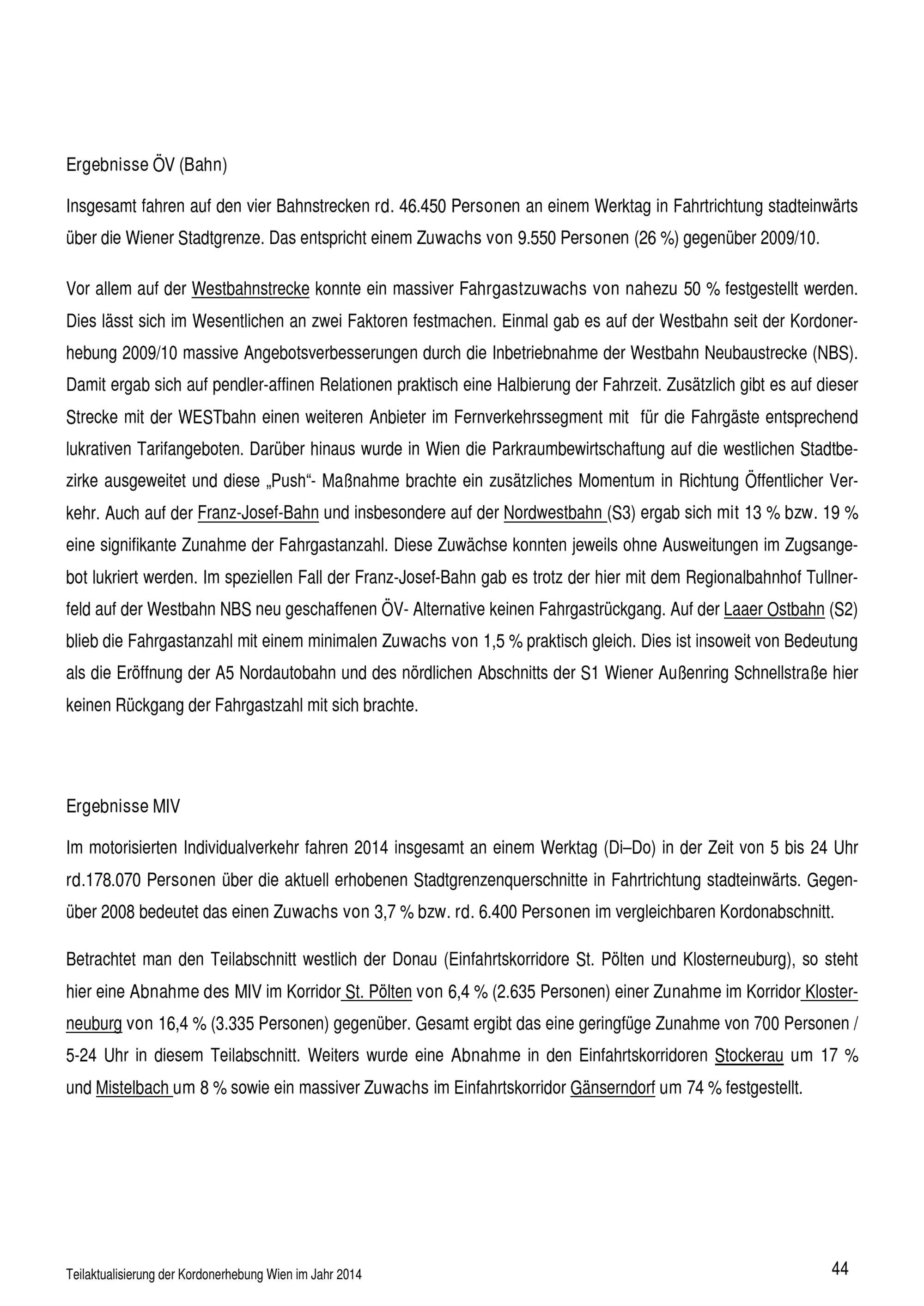 Teilaktualisierung der Kordonerhebung Wien : für die Korridore St. Pölten bis Gänserndorf im Jahr 2014 : Ergebnisse aus dem Endbericht / Auftraggeber: Amt der niederösterreichischen Landesregierung Gruppe Raumordnung, Umwelt und Verkehr, Magistrat der Stadt Wien MA 18 - Stadtentwicklung u Stadtplanung ; Auftragnehmer: Technisches Büro für Verkehrswesen und Verkehrswirtschaft, DI Rittler Christian ; Koordination/Bearbeitung: Planungsgemeinschaft OST im Rahmen der PGO-Plattform Regionalverkehr