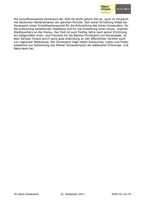 50 Jahre Donaupark: stadtplanerische Vision und Dimension : Studie zu den stadtplanerischen Visionen und Strategien, die zur Realisierung der Wiener Internationalen Gartenschau WIG 64 und zur Errichtung des Donauparks führten ; Endbericht / Im Auftrag der Magistratsabteilung 18 - Stadtentwicklung und Stadtplanung ; Auftragnehmer: Universität für Bodenkultur Wien ILA Institut für Landschaftsarchitektur ; Lilli Licka, Ulrike Krippner