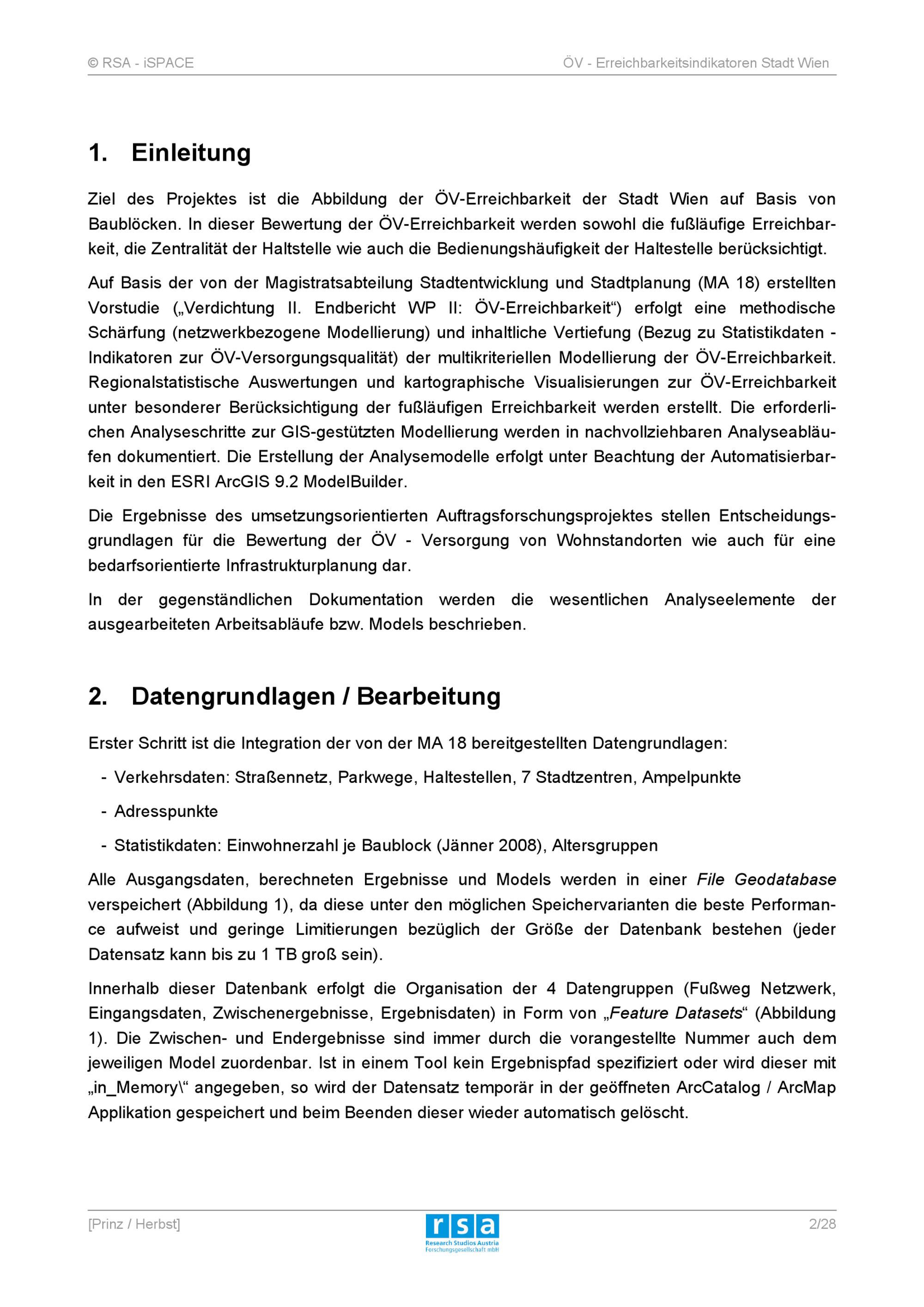 Multikriterielle Modellierung der ÖV-Erreichbarkeit für die Stadt Wien : Dokumentation zum Forschungsprojekt / Auftraggeber: Stadt Wien, Magistratsabteilung 18 - Stadtentwicklung und Stadtplanung ; Auftragnehmer: Research Studios Austria Forschungsgesellschaft mbH ; Verfasser: Thomas Prinz, Stefan Herbst