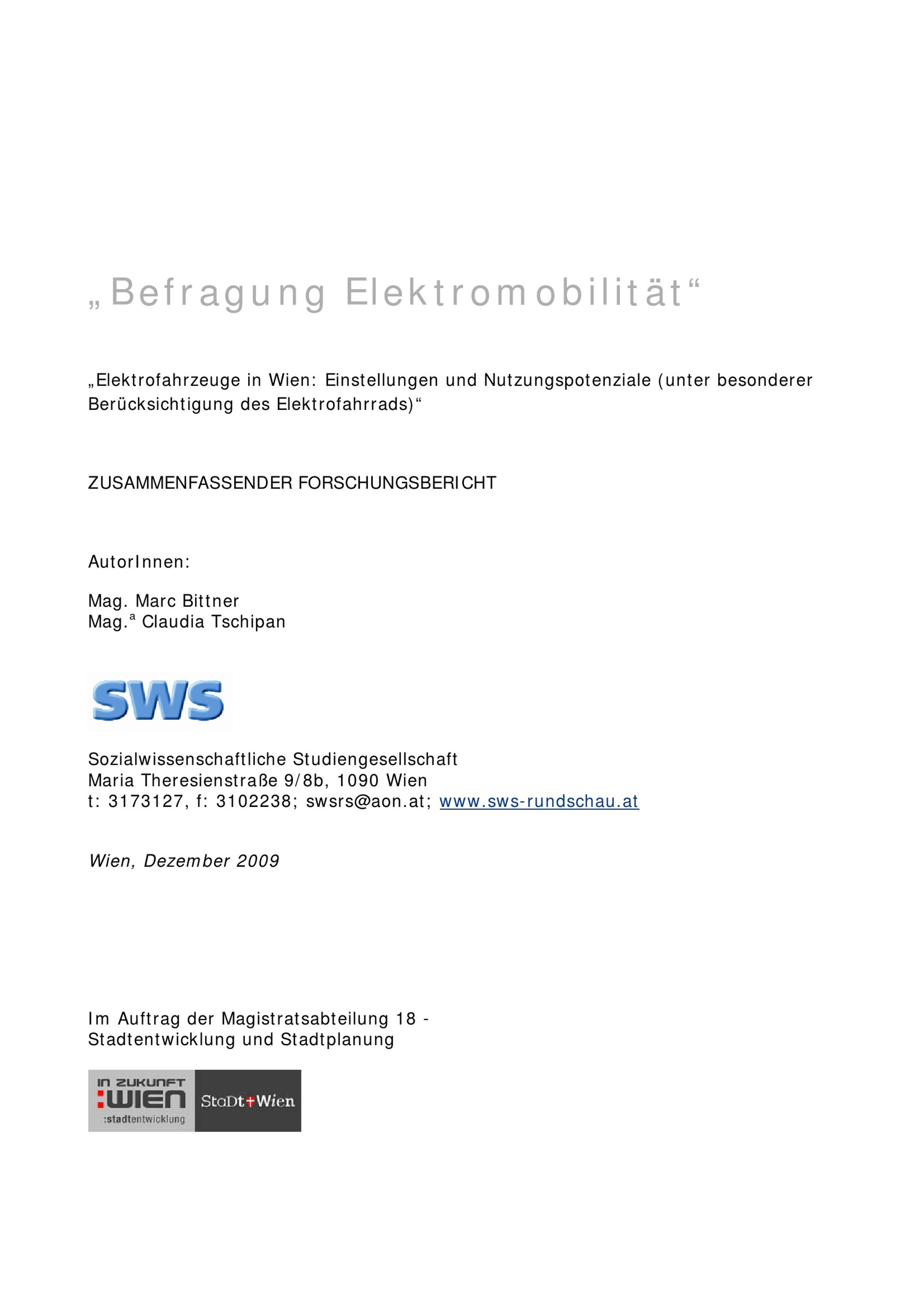 Befragung Elektromobilität : Elektrofahrzeuge in Wien: Einstellungen und Nutzungspotenziale (unter besonderer Berücksichtigung des Elektrofahrrads) : zusammenfassender Forschungsbericht / AutorInnen: Marc Bittner, Claudia Tschipan ; im Auftrag der Magistratsabteilung 18 - Stadtentwicklung und Stadtplanung ; Auftragnehmer: Sozialwissenschaftliche Studiengesellschaft