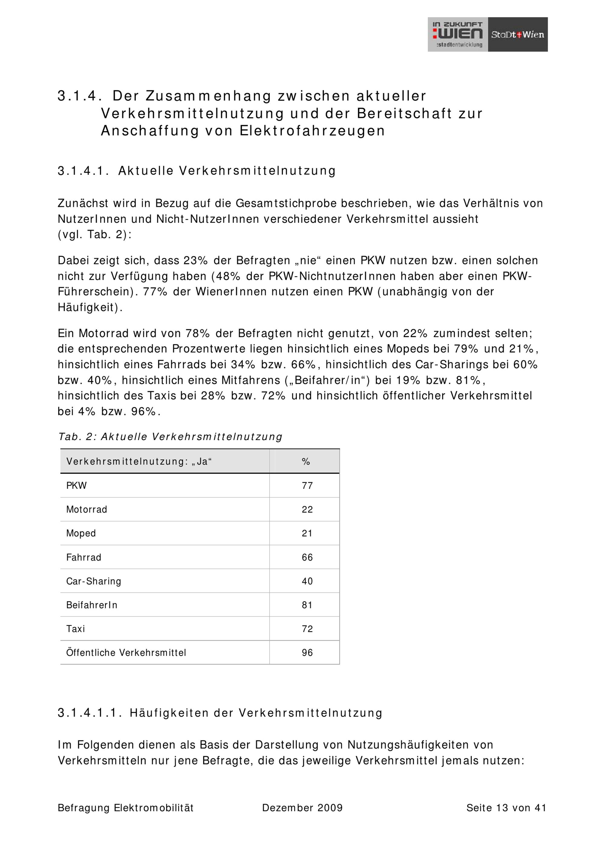 Befragung Elektromobilität : Elektrofahrzeuge in Wien: Einstellungen und Nutzungspotenziale (unter besonderer Berücksichtigung des Elektrofahrrads) : zusammenfassender Forschungsbericht / AutorInnen: Marc Bittner, Claudia Tschipan ; im Auftrag der Magistratsabteilung 18 - Stadtentwicklung und Stadtplanung ; Auftragnehmer: Sozialwissenschaftliche Studiengesellschaft