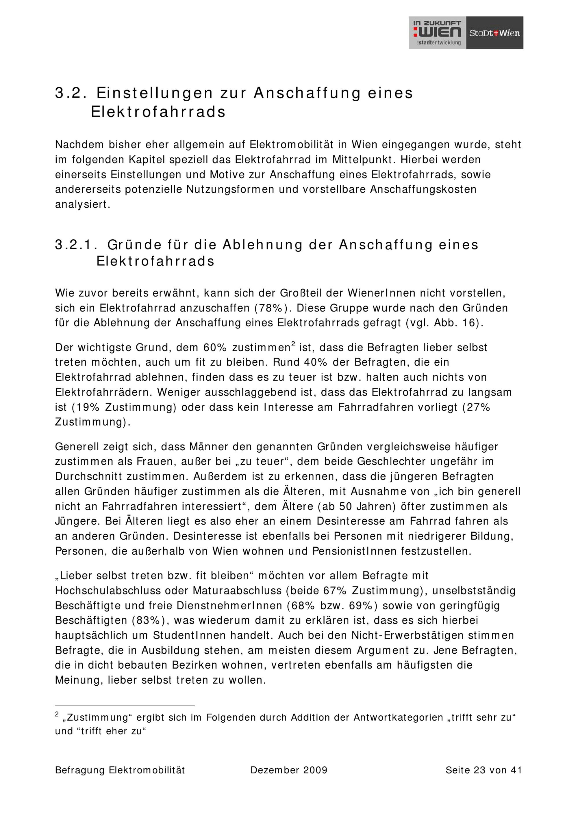 Befragung Elektromobilität : Elektrofahrzeuge in Wien: Einstellungen und Nutzungspotenziale (unter besonderer Berücksichtigung des Elektrofahrrads) : zusammenfassender Forschungsbericht / AutorInnen: Marc Bittner, Claudia Tschipan ; im Auftrag der Magistratsabteilung 18 - Stadtentwicklung und Stadtplanung ; Auftragnehmer: Sozialwissenschaftliche Studiengesellschaft