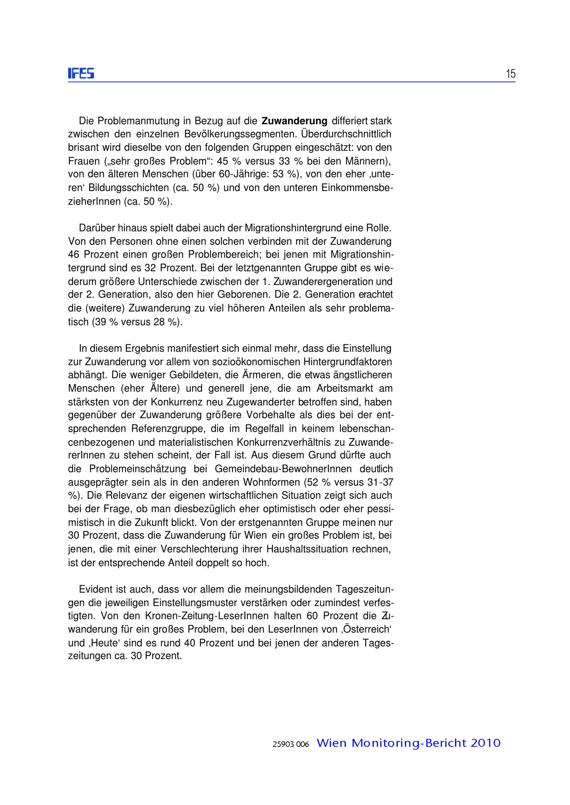Zusammenleben von verschiedenen Bevölkerungsgruppen in Wien : Monitoringstudie 2010 ; Studienbericht / diese Studie wurde erstellt für die: Magistratsabteilung 18 - Stadtentwicklung und Stadtplanung, Magistratsabteilung 17 - Integration und Diversität ; IFES - Institut für empirische Sozialforschung GmbH
