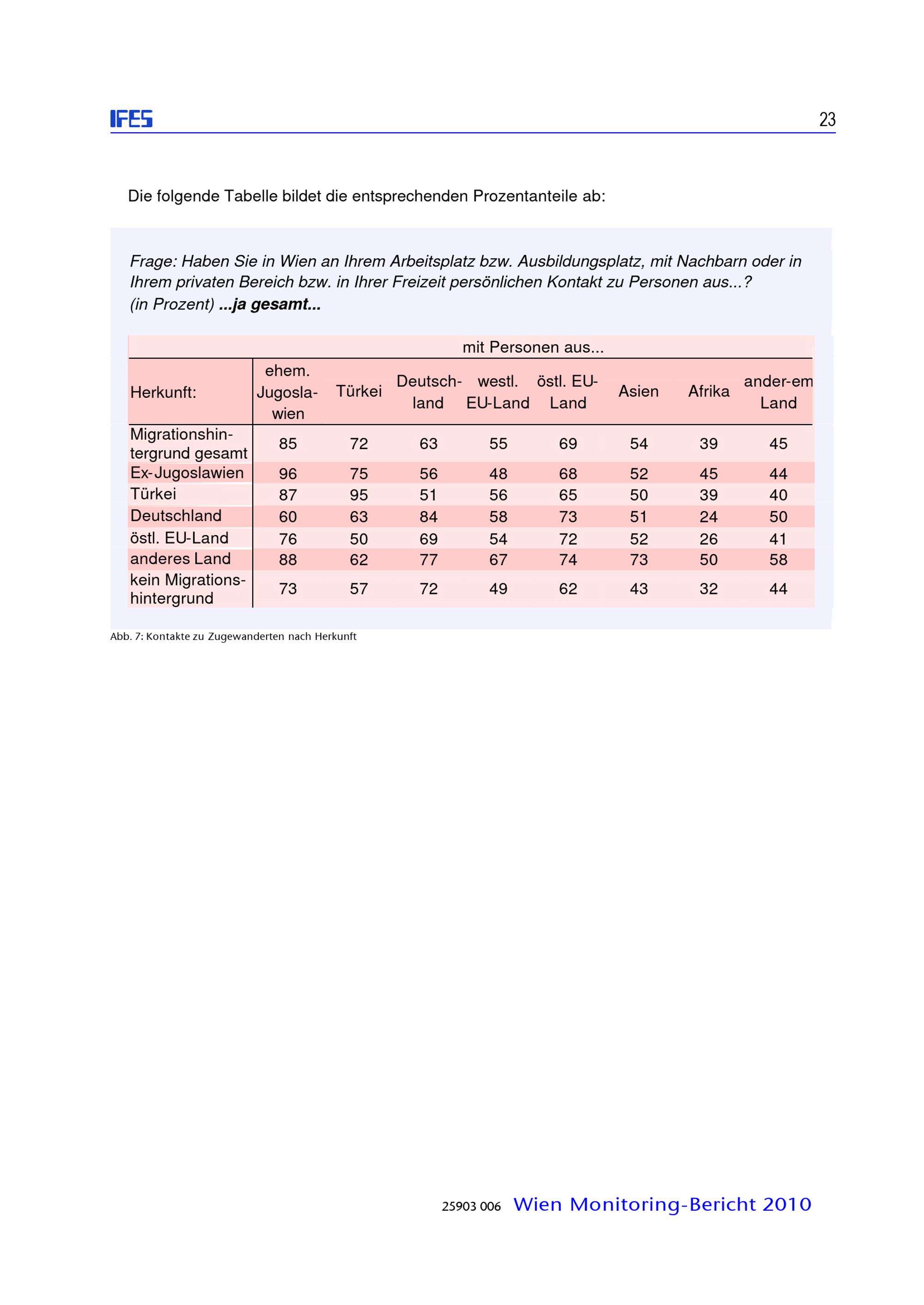 Zusammenleben von verschiedenen Bevölkerungsgruppen in Wien : Monitoringstudie 2010 ; Studienbericht / diese Studie wurde erstellt für die: Magistratsabteilung 18 - Stadtentwicklung und Stadtplanung, Magistratsabteilung 17 - Integration und Diversität ; IFES - Institut für empirische Sozialforschung GmbH