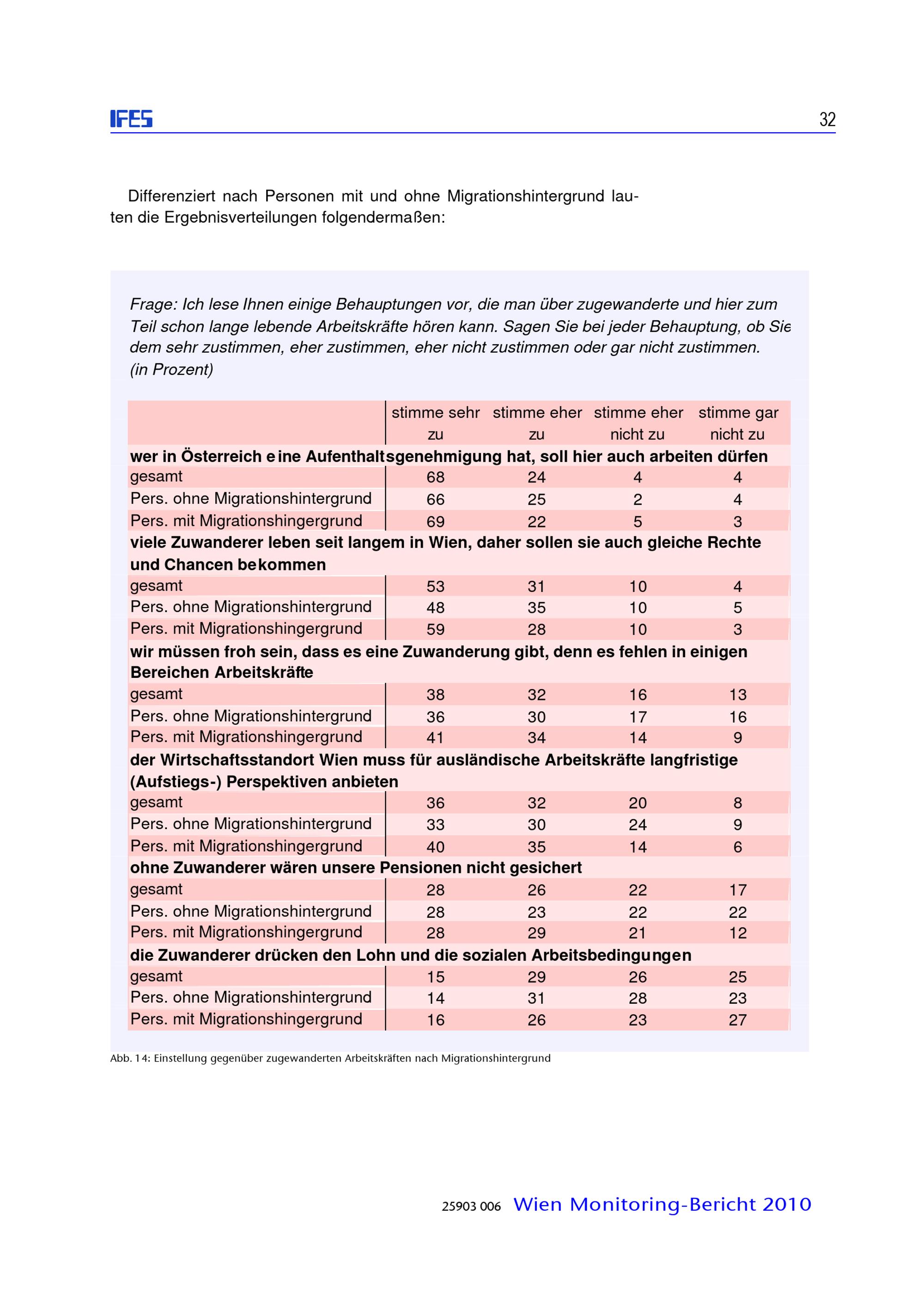 Zusammenleben von verschiedenen Bevölkerungsgruppen in Wien : Monitoringstudie 2010 ; Studienbericht / diese Studie wurde erstellt für die: Magistratsabteilung 18 - Stadtentwicklung und Stadtplanung, Magistratsabteilung 17 - Integration und Diversität ; IFES - Institut für empirische Sozialforschung GmbH