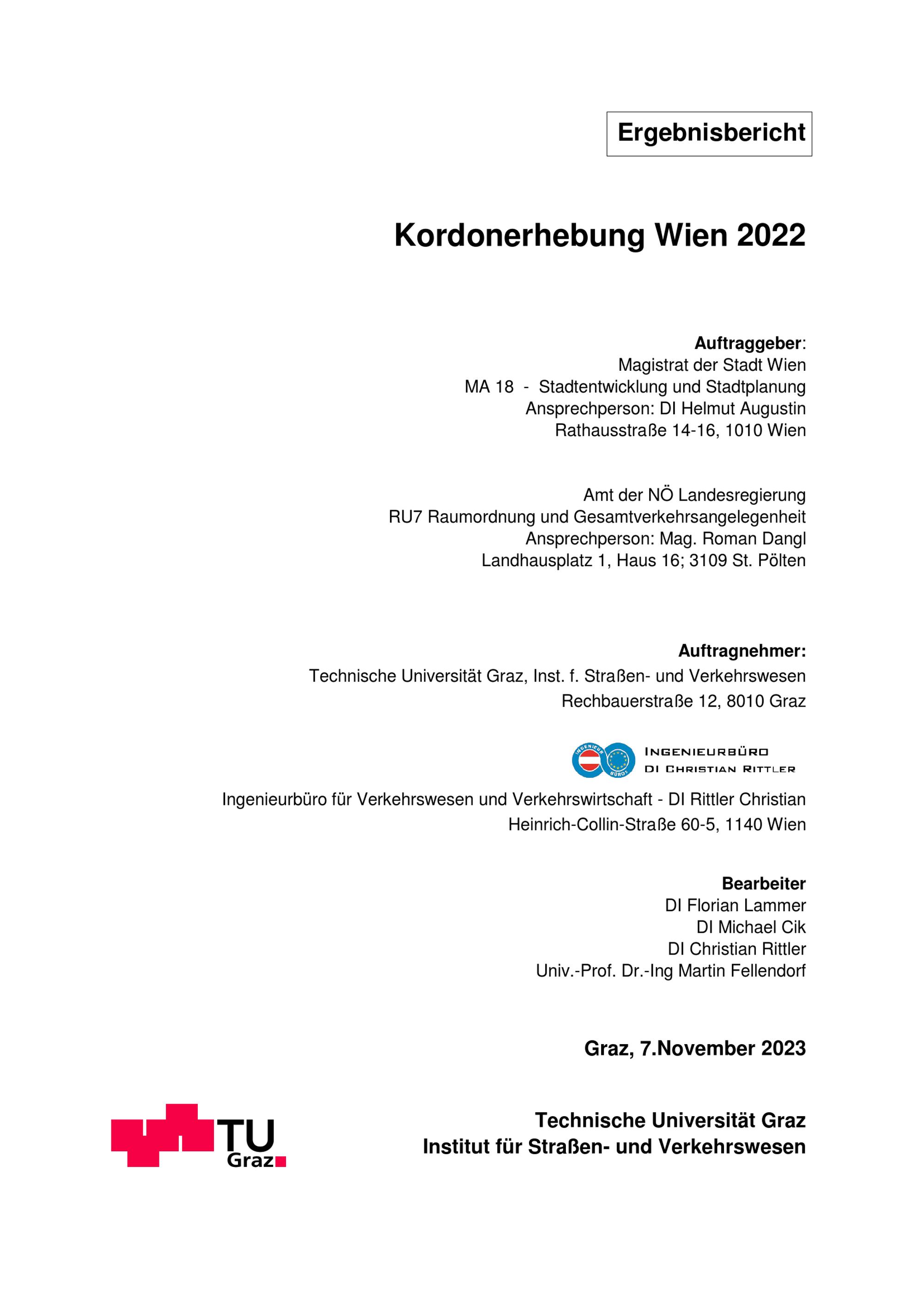 Kordonerhebung Wien 2022 : Ergebnisbericht / Auftraggeber: Magistrat der Stadt Wien MA 18 - Stadtentwicklung und Stadtplanung, Amt der NÖ Landesregierung RU7 Raumordnung und Gesamtverkehrsangelegenheit ; Auftragnehmer: Technische Universität Graz, Inst. f. Straßen- und Verkehrswesen, Ingenieurbüro für Verkehrswesen und Verkehrswirtschaft - DI Rittler Christian