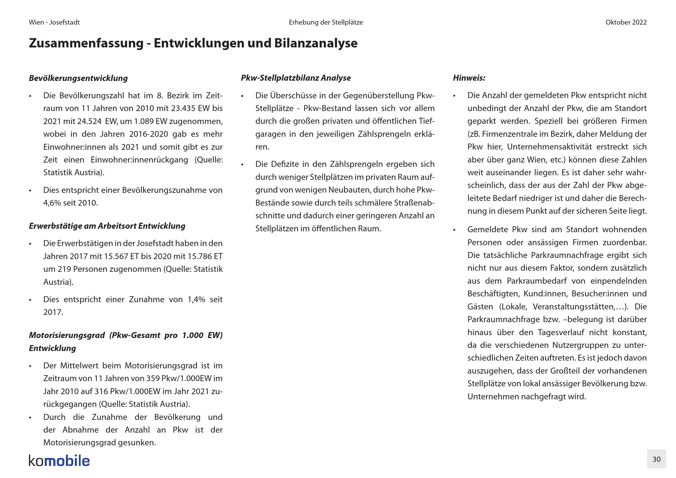 Erhebung der Stellplätze in Wien-Josefstadt : Endbericht / Erstellt im Auftrag der Bezirksvorstehung Wien Josefstadt und der MA 18 ; Bearbeitung: DI Dr. Romain Molitor, Thomas Hirsch, komobile GmbH Büro für Verkehrsplanung